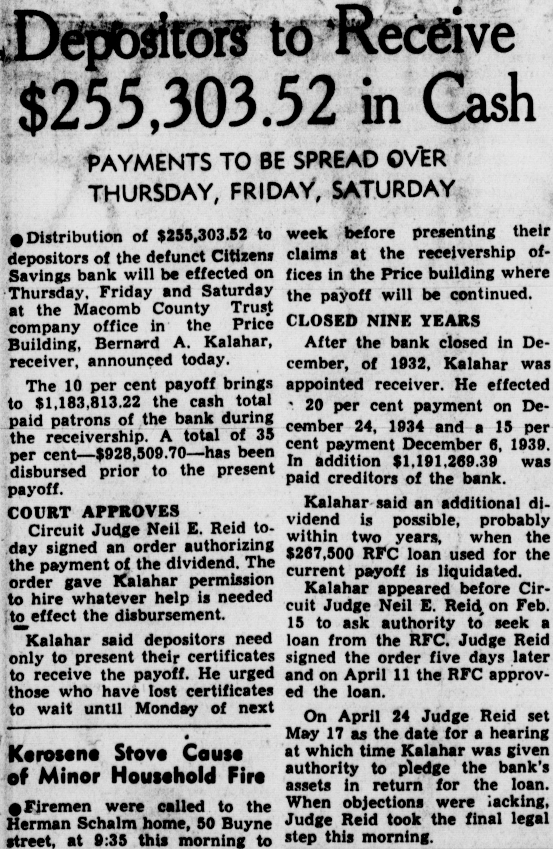 Depositors to Receive $255,303.52 in Cash PAYMENTS TO BE SPREAD OVER THURSDAY, FRIDAY, SATURDAY Distribution of $255,303.52 to week before presenting their claims at the receivership ofdepositors of the defunct Citizens fices in the Price building where Savings bank will be effected on Thursday, Friday and Saturday the payoff will be continued. at the Macomb County Trust CLOSED NINE YEARS company office in the Price After the bank closed in DeBuilding, Bernard A. Kalahar, receiver, announced today. cember, of 1932, Kalahar was appointed receiver. He effected The 10 per cent payoff brings to $1,183,813.22 the cash total 20 per cent payment on Depaid patrons of the bank during cember 24, 1934 and a 15 per the receivership. A total of 35 cent payment December 6, 1939. per cent-$928,509.70-has been In addition $1,191,269.39 was disbursed prior to the present paid creditors of the bank. payoff. Kalahar said an additional diCOURT APPROVES vidend is possible, probably Circuit Judge Neil E. Reid towithin two years, when the day signed an order authorizing $267,500 RFC loan used for the the payment of the dividend. The current payoff is liquidated. order gave Kalahar permission Kalahar appeared before Cirto hire whatever help is needed cuit Judge Neil E. Reid on Feb. to effect the disbursement. 15 to ask authority to seek a Kalahar said depositors need loan from the RFC. Judge Reid signed the order five days later only to present their certificates and on April 11 the RFC approvto receive the payoff. He urged ed the loan. those who have lost certificates to wait until Monday of next On April 24 Judge Reid set May 17 as the date for a hearing at which time Kalahar was given Kerosene Stove Cause authority to pledge the bank's of Minor Household Fire assets in return for the loan. When objections were lacking, Firemen were called to the Judge Reid took the final legal Herman Schalm home, 50 Buyne step this morning. street, at 9:35 this morning to