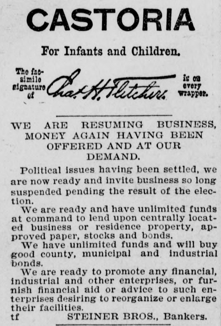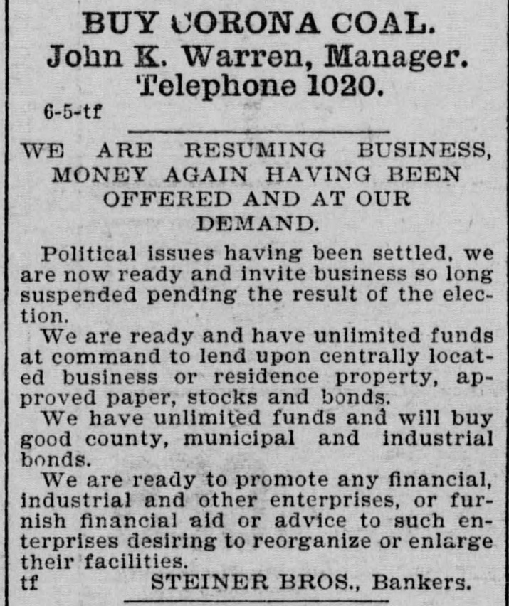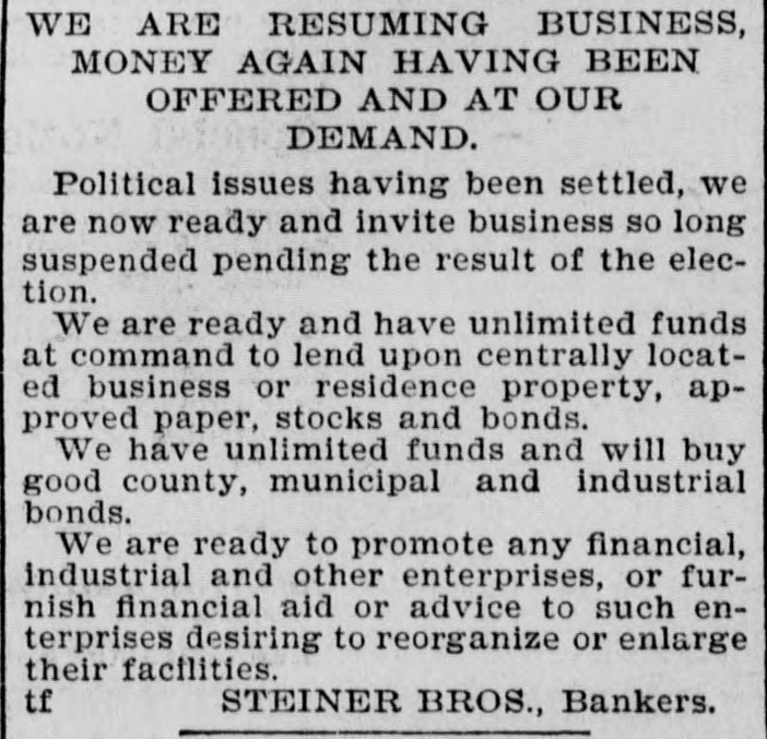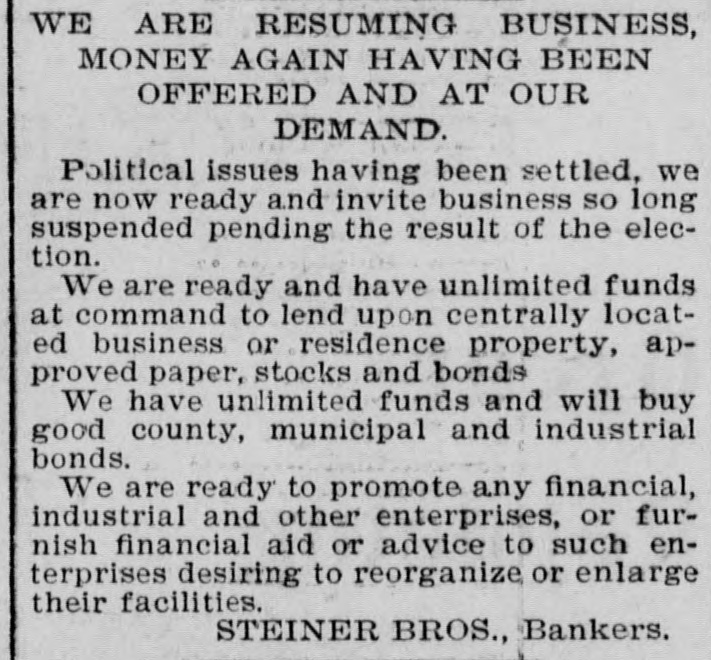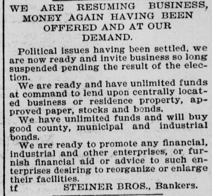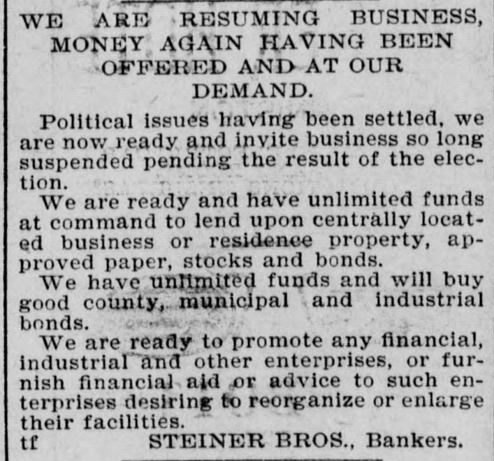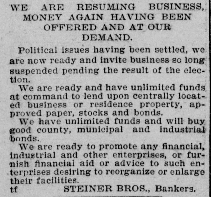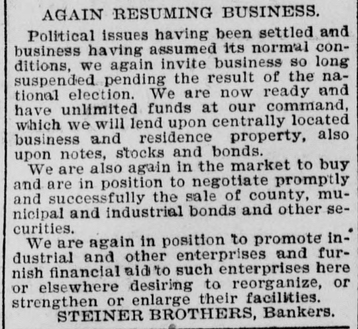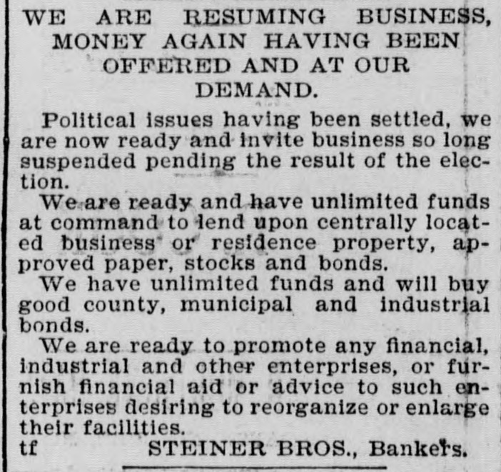 WE ARE RESUMING BUSINESS, MONEY AGAIN HAVING BEEN OFFERED AND AT OUR DEMAND. Political issues having been settled, we are now ready and invite business so long suspended pending the result of the election. We are ready and have unlimited funds at command to lend upon centrally located business or residence property, approved paper, stocks and bonds We have unlimited funds and will buy good county, municipal and industrial bonds. We are ready to promote any financial, industrial and other enterprises, or furnish financial aid or advice to such enterprises desiring to reorganize or enlarge their facilities. STEINER BROS., Bankers.