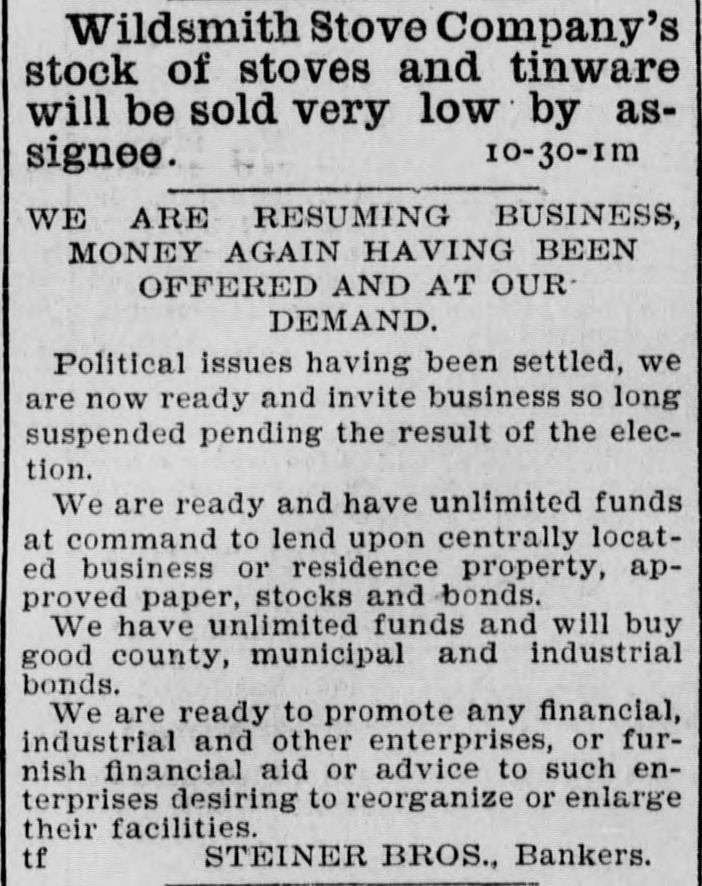 Wildsmith Stove Company's stock of stoves and tinware will be sold very low by as10-30-1m signee. WE ARE RESUMING BUSINESS, MONEY AGAIN HAVING BEEN OFFERED AND AT OUR DEMAND. Political issues having been settled, we are now ready and invite business so long suspended pending the result of the election. We are ready and have unlimited funds at command to lend upon centrally located business or residence property, approved paper, stocks and bonds. We have unlimited funds and will buy good county, municipal and industrial bonds. We are ready to promote any financial, industrial and other enterprises, or furnish financial aid or advice to such enterprises desiring to reorganize or enlarge their facilities. tf STEINER BROS., Bankers.