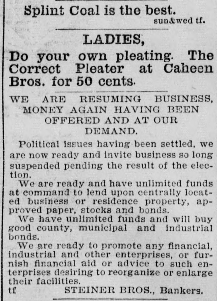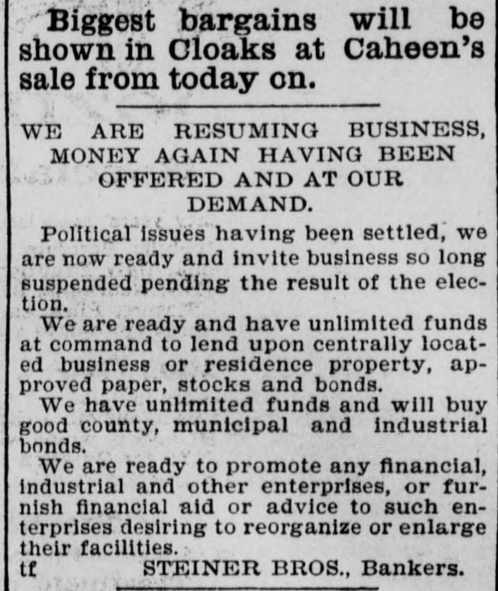 Biggest bargains will be shown in Cloaks at Caheen's sale from today on. WE ARE RESUMING BUSINESS, MONEY AGAIN HAVING BEEN OFFERED AND AT OUR DEMAND. Political issues having been settled, we are now ready and invite business so long suspended pending the result of the election. We are ready and have unlimited funds at command to lend upon centrally located business or residence property, approved paper, stocks and bonds. We have unlimited funds and will buy good county, municipal and industrial bonds. We are ready to promote any financial, industrial and other enterprises, or furnish financial aid or advice to such enterprises desiring to reorganize or enlarge their facilities. tf STEINER BROS., Bankers.