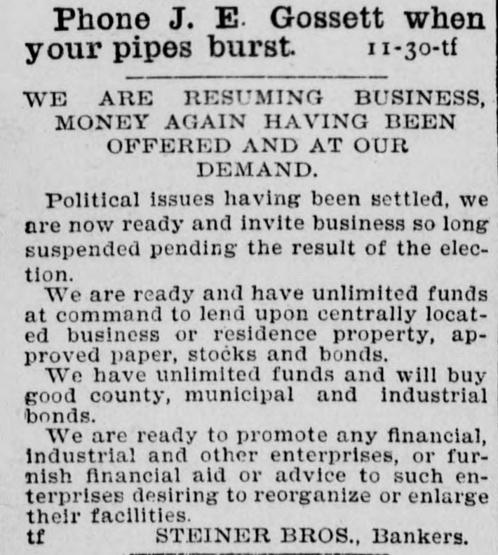 Phone J. E. Gossett when II-30-tf your pipes burst. WE ARE RESUMING BUSINESS, MONEY AGAIN HAVING BEEN OFFERED AND AT OUR DEMAND. Political issues having been settled, we are now ready and invite business so long suspended pending the result of the election. We are ready and have unlimited funds at command to lend upon centrally located business or residence property, approved paper, stocks and bonds. We have unlimited funds and will buy good county, municipal and industrial bonds. We are ready to promote any financial, industrial and other enterprises, or furnish financial aid or advice to such enterprises desiring to reorganize or enlarge their facilities. tf STEINER BROS., Bankers.