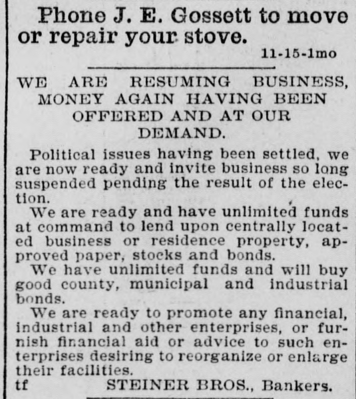 Phone J. E. Gossett to move or repair your stove. 11-15-1mo WE ARE RESUMING BUSINESS, MONEY AGAIN HAVING BEEN OFFERED AND AT OUR DEMAND. Political issues having been settled, we are now ready and invite business so long suspended pending the result of the election. We are ready and have unlimited funds at command to lend upon centrally located business or residence property, approved paper, stocks and bonds. We have unlimited funds and will buy good county, municipal and industrial bonds. We are ready to promote any financial, industrial and other enterprises, or furnish financial aid or advice to such enterprises desiring to reorganize or enlarge their facilities. tf STEINER BROS., Bankers.
