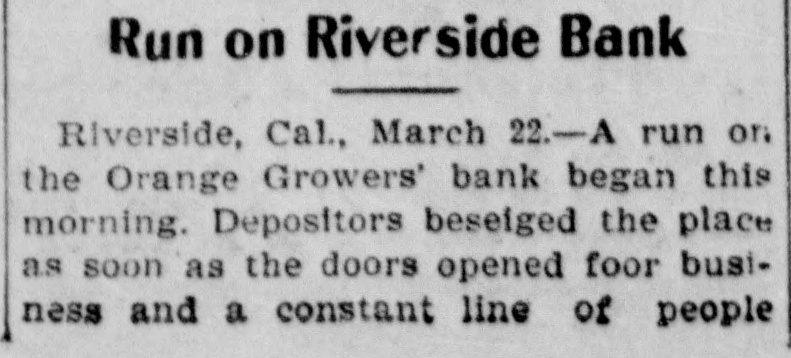 Contemporary newspaper (Mar 22, 1904) reports a run on the Orange Growers' Bank in Riverside beginning that morning. No mention of suspension, reopening, or failure in the provided excerpt. Cause not specified in the text.