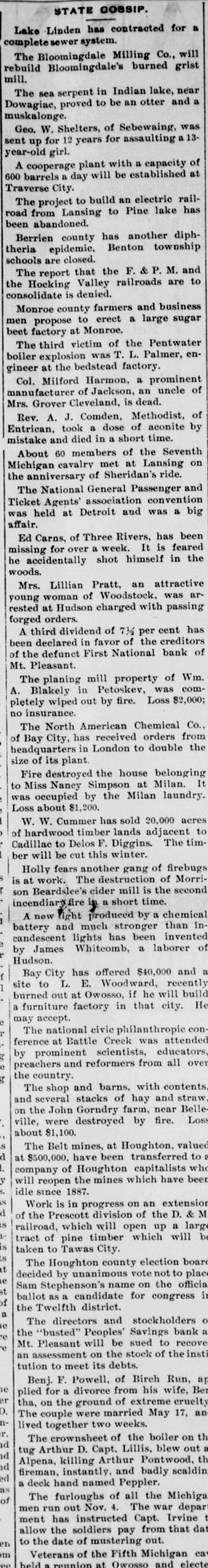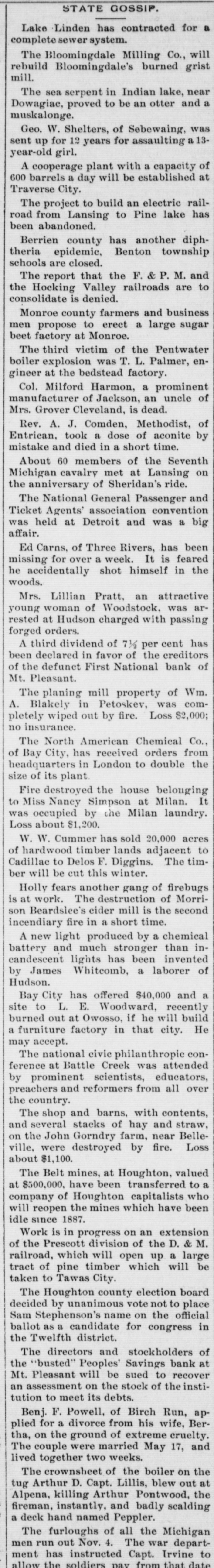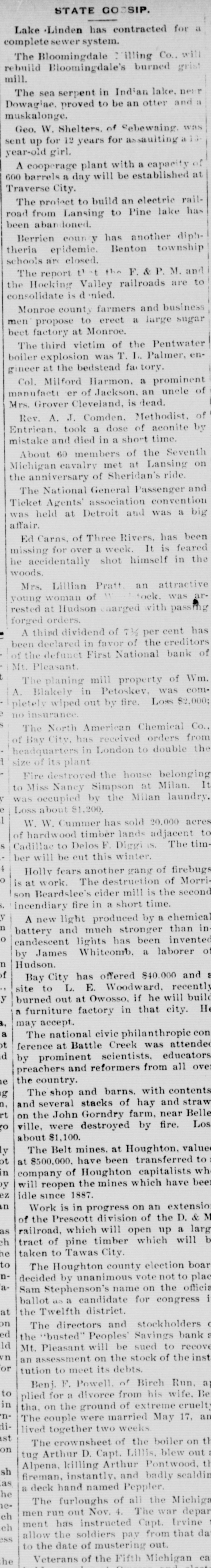 STATE GOSSIP. Lake Linden has contracted for complete sewer system. The Bloomingdale Milling Co., will rebuild Bloomingdale's burned grist mill. The sea serpent in Indian lake, near Dowagiac, proved to be an otter and muskalonge. Geo. W. Shelters, of Sebewaing, was sent up for 12 years for assaulting a 13year-old girl. A cooperage plant with a capacity of 600 barrels a day will be established at Traverse City. The project to build an electric railroad from Lansing to Pine lake has been abandoned. Berrien county has another diphtheria epidemic, Benton township schools are closed. The report that the F. & P. M. and the Hocking Valley railroads are to consolidate is denied. Monroe county farmers and business men propose to erect a large sugar beet factory at Monroe. The third victim of the Pentwater boiler explosion was T. L. Palmer, engineer at the bedstead factory. Col. Milford Harmon, a prominent manufacturer of Jackson, an uncle of Mrs. Grover Cleveland, is dead. Rev. A. J. Comden, Methodist, of Entrican, took a dose of aconite by mistake and died in a short time. About 60 members of the Seventh Michigan cavalry met at Lansing on the anniversary of Sheridan's ride. The National General Passenger and Ticket Agents' association convention was held at Detroit and was a big affair. Ed Carns, of Three Rivers, has been missing for over a week. It is feared he accidentally shot himself in the woods. Mrs. Lillian Pratt. an attractive young woman of Woodstock. was arrested at Hudson charged with passing forged orders. A third dividend of 71/2 per cent has been declared in favor of the creditors of the defunct First National bank of Mt. Pleasant. The planing mill property of Wm. A. Blakely in Petoskev, was completely wiped out by fire. Loss $2,000; no insurance. The North American Chemical Co., of Bay City, has received orders from headquarters in London to double the size of its plant Fire destroyed the house belonging to Miss Naney Simpson at Milan. It was occupied by the Milan laundry. Loss about $1,200. W. W. Cummer has sold 20,000 acres of hardwood timber lands adjacent to Cadillac to Delos F. Diggins. The timber will be cut this winter. Holly fears another gang of firebugs is at work. The destruction of Morrison Beardslee's cider mill is the second incendiary fire in a short time. A new light produced by a chemical battery and much stronger than incandescent lights has been invented by James Whiteomb, a laborer of Hudson. Bay City has offered $40,000 and a site to L. E. Woodward, recently burned out at Owosso, if he will build a furniture factory in that city. He may accept. The national civic philanthropie conference at Battle Creek was attended by prominent scientists, educators, preachers and reformers from all over country. The shop and barns, with contents, and straw, on near Bellethe several John stacks Gorndry of farm, hay and ville, were destroyed by fire. Loss about $1,100. The Belt mines, at Houghton, valued at a $500,000, of have Houghton been transferred capitalists to company who will reopen the mines which have been idle since 1887. Work is in progress on an extension of of a large tract be railroad, the of Prescott pine which timber division will open which the up will D. & M. taken to Tawas City. The Houghton county election board decided by unanimous vote not to place Sam Stephenson's name on the official ballot as a candidate for congress in the Twelfth district. The directors and stockholders of the "busted" Peoples' Savings bank at Mt. Pleasant will be sued to recover an assessment on the stock of theinstitution to meet its debts. Benj. F. Powell, of Birch Run, applied for a divorce from his wife, Bertha, on the ground of extreme cruelty. The couple were married May 17, and lived together two weeks. The crownsheet of the boiler on the tug Arthur D. Capt. Lillis, blew out at Alpena, killing Arthur Pontwood, the fireman, instantly. and badly scalding a deck hand named Peppler. the men run 4. war ment The has furloughs out instructed Nov. of all The Capt. Michigan Irvine depart- to allow the soldiers pay from date
