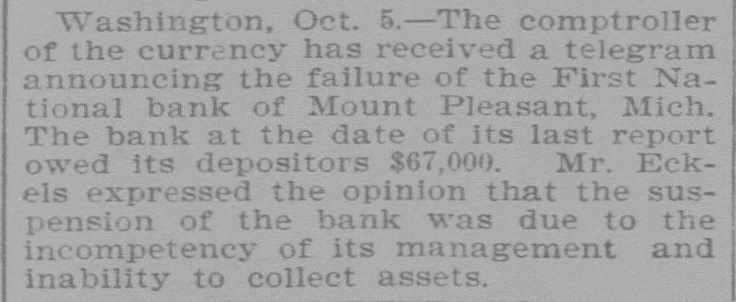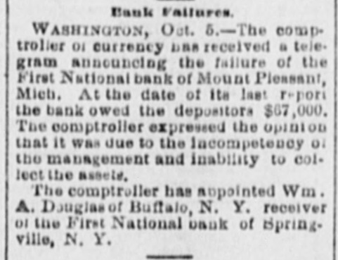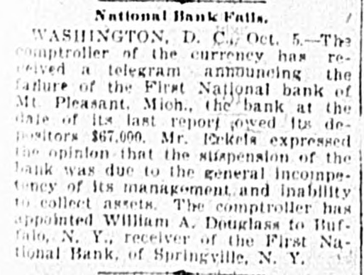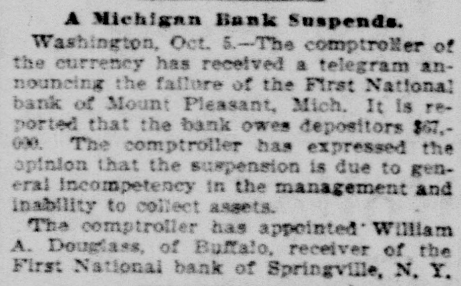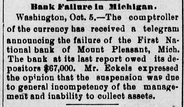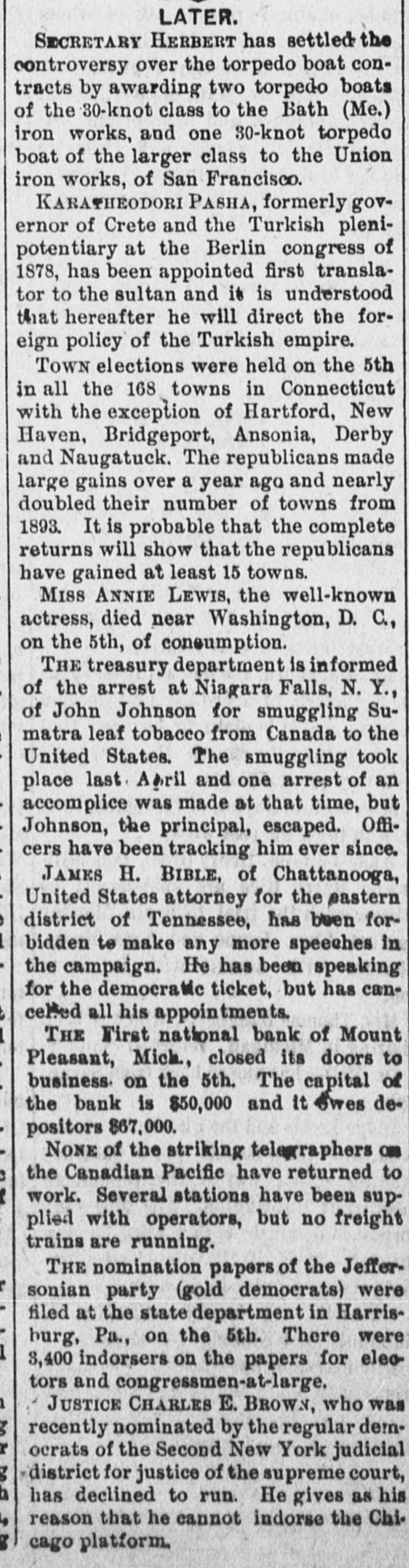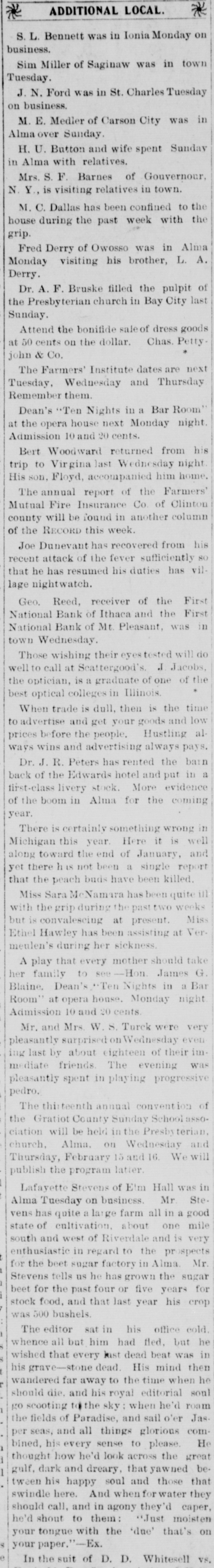 STATE GOSSIP. Lake Linden has contracted for complete sewer system. The Bloomingdale Milling Co., will rebuild Bloomingdale's burned grist mill. The sea serpent in Indian lake, near Dowagiac, proved to be an otter and muskalonge. Geo. W. Shelters, of Sebewaing, was sent up for 12 years for assaulting a 13year-old girl. A cooperage plant with a capacity of 600 barrels a day will be established at Traverse City. The project to build an electric railroad from Lansing to Pine lake has been abandoned. Berrien county has another diphtheria epidemic, Benton township schools are closed. The report that the F. & P. M. and the Hocking Valley railroads are to consolidate is denied. Monroe county farmers and business men propose to erect a large sugar beet factory at Monroe. The third victim of the Pentwater boiler explosion was T. L. Palmer, engineer at the bedstead factory. Col. Milford Harmon, a prominent manufacturer of Jackson, an uncle of Mrs. Grover Cleveland, is dead. Rev. A. J. Comden, Methodist, of Entrican, took a dose of aconite by mistake and died in a short time. About 60 members of the Seventh Michigan cavalry met at Lansing on the anniversary of Sheridan's ride. The National General Passenger and Ticket Agents' association convention was held at Detroit and was a big affair. Ed Carns, of Three Rivers, has been missing for over a week. It is feared he accidentally shot himself in the woods. Mrs. Lillian Pratt. an attractive young woman of Woodstock. was arrested at Hudson charged with passing forged orders. A third dividend of 71/2 per cent has been declared in favor of the creditors of the defunct First National bank of Mt. Pleasant. The planing mill property of Wm. A. Blakely in Petoskev, was completely wiped out by fire. Loss $2,000; no insurance. The North American Chemical Co., of Bay City, has received orders from headquarters in London to double the size of its plant Fire destroyed the house belonging to Miss Naney Simpson at Milan. It was occupied by the Milan laundry. Loss about $1,200. W. W. Cummer has sold 20,000 acres of hardwood timber lands adjacent to Cadillac to Delos F. Diggins. The timber will be cut this winter. Holly fears another gang of firebugs is at work. The destruction of Morrison Beardslee's cider mill is the second incendiary fire in a short time. A new light produced by a chemical battery and much stronger than incandescent lights has been invented by James Whiteomb, a laborer of Hudson. Bay City has offered $40,000 and a site to L. E. Woodward, recently burned out at Owosso, if he will build a furniture factory in that city. He may accept. The national civic philanthropie conference at Battle Creek was attended by prominent scientists, educators, preachers and reformers from all over country. The shop and barns, with contents, and straw, on near Bellethe several John stacks Gorndry of farm, hay and ville, were destroyed by fire. Loss about $1,100. The Belt mines, at Houghton, valued at a $500,000, of have Houghton been transferred capitalists to company who will reopen the mines which have been idle since 1887. Work is in progress on an extension of of a large tract be railroad, the of Prescott pine which timber division will open which the up will D. & M. taken to Tawas City. The Houghton county election board decided by unanimous vote not to place Sam Stephenson's name on the official ballot as a candidate for congress in the Twelfth district. The directors and stockholders of the "busted" Peoples' Savings bank at Mt. Pleasant will be sued to recover an assessment on the stock of theinstitution to meet its debts. Benj. F. Powell, of Birch Run, applied for a divorce from his wife, Bertha, on the ground of extreme cruelty. The couple were married May 17, and lived together two weeks. The crownsheet of the boiler on the tug Arthur D. Capt. Lillis, blew out at Alpena, killing Arthur Pontwood, the fireman, instantly. and badly scalding a deck hand named Peppler. the men run 4. war ment The has furloughs out instructed Nov. of all The Capt. Michigan Irvine depart- to allow the soldiers pay from date
