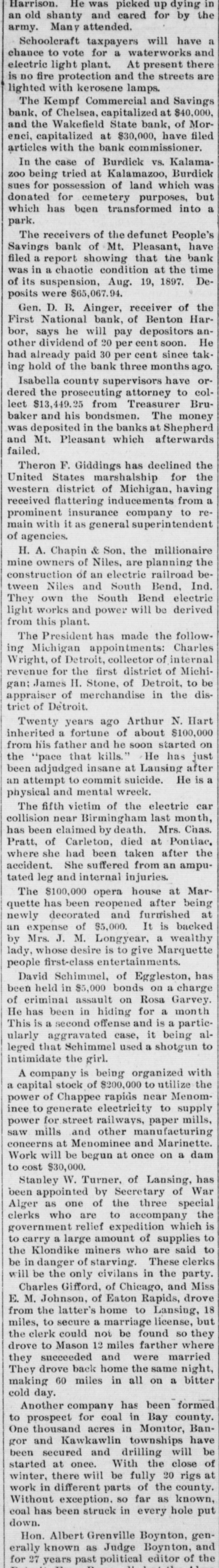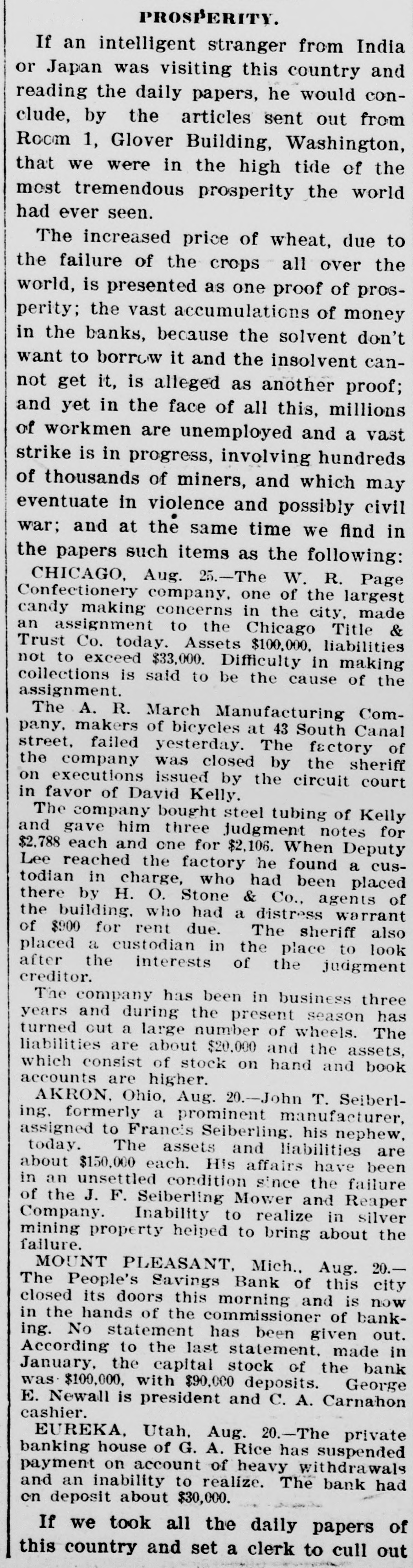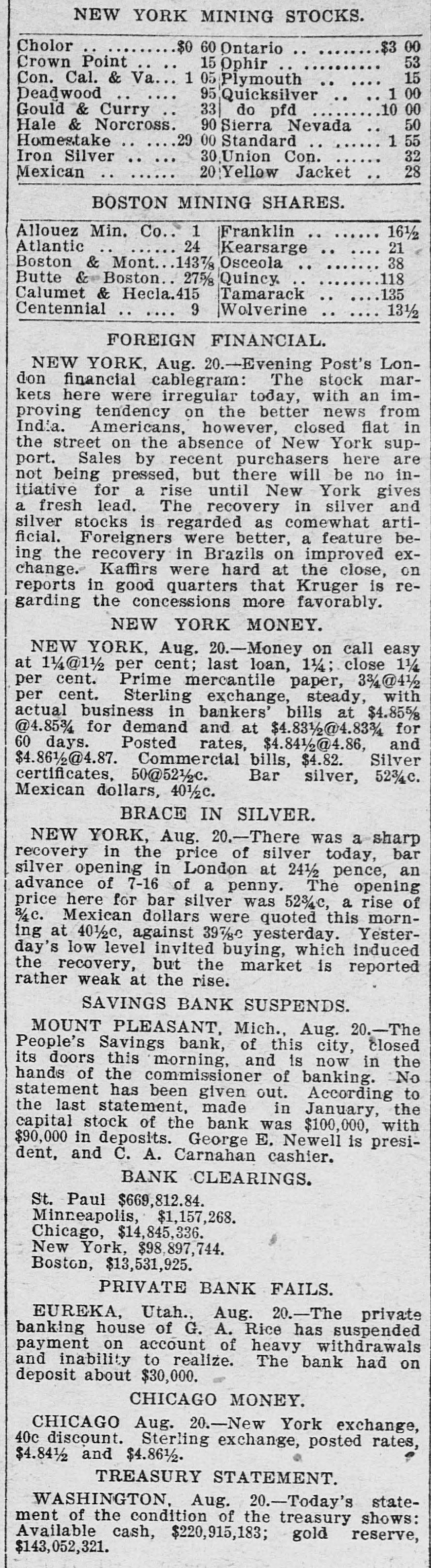 NEW YORK MINING STOCKS. Cholor $0 60 Ontario $3 00 Crown Point 53 15 Ophir Con. Cal. & Va 15 1 05 Plymouth Deadwood 1 00 95 Quicksilver 10 00 Gould & Curry 33 do pfd 50 Hale & Norcross. 90 Sierra Nevada Homestake 29 00 Standard 1 55 Iron Silver 32 30 Union Con. 28 Mexican 20 Yellow Jacket BOSTON MINING SHARES. 1 Allouez Min. Co Franklin 161/2 Atlantic 24 21 Kearsarge Boston & Mont Osceola 38 1437/8 118 Butte & Boston 275/8 Quincy Calumet & Hecla.415 Tamarack 135 Centennial 9 Wolverine 13 1/2 FOREIGN FINANCIAL. NEW YORK, Aug. 20.-Evening Post's London financial cablegram: The stock markets here were irregular today, with an improving tendency on the better news from India. Americans, however, closed flat in the street on the absence of New York support. Sales by recent purchasers here are not being pressed, but there will be no initiative for a rise until New York gives a fresh lead. The recovery in silver and silver stocks is regarded as comewhat artificial. Foreigners were better, a feature being the recovery in Brazils on improved exchange. Kaffirs were hard at the close, on reports in good quarters that Kruger is regarding the concessions more favorably. NEW YORK MONEY. NEW YORK, Aug. 20.-Money on call easy at 11/4@11/2 per cent; last loan, 11/4; close 11/4 per cent. Prime mercantile paper, 33/4@41/2 per cent. Sterling exchange, steady, with actual business in bankers' bills at $4.85% @4.853/4 for demand and at $4.831/@4.8334 for 60 days. Posted rates, $4.841/2@4.86, and $4.861/2@4.87. Commercial bills, $4.82. Silver certificates, 50@521/2c. Bar 523/c. silver, Mexican dollars, 401/2c. BRACE IN SILVER. NEW YORK, Aug. 20.-There was a sharp recovery in the price of silver today, bar silver opening in London at 241/2 pence, an advance of 7-16 of a penny. The opening price here for bar silver was 523/c, a rise of 3/4c. Mexican dollars were quoted this morning at 401/2c, against 397/80 yesterday. Yesterday's low level invited buying, which induced the recovery, but the market is reported rather weak at the rise. SAVINGS BANK SUSPENDS. MOUNT PLEASANT, Mich., Aug. 20.-The People's Savings bank, of this city, closed its doors this morning, and is now in the hands of the commissioner of banking. No statement has been given out. According to the last statement, made in January, the capital stock of the bank was $100,000, with $90,000 in deposits. George E. Newell is president, and C. A. Carnahan cashier. BANK CLEARINGS. St. Paul $669,812.84. Minneapolis, $1,157,268. Chicago, $14,845,336. New York. $98,897,744. Boston, $13,531,925. PRIVATE BANK FAILS. EUREKA, Utah., Aug. 20.-The private banking house of G. A. Rice has suspended payment on account of heavy withdrawals and inability to realize. The bank had on deposit about $30,000. CHICAGO MONEY. CHICAGO Aug. 20.-New York exchange, 40c discount. Sterling exchange, posted rates, $4.841/2 and $4.861/2. TREASURY STATEMENT. WASHINGTON. Aug. 20.-Today's statement of the condition of the treasury shows: Available cash, $220,915,183; gold reserve, $143,052,321.