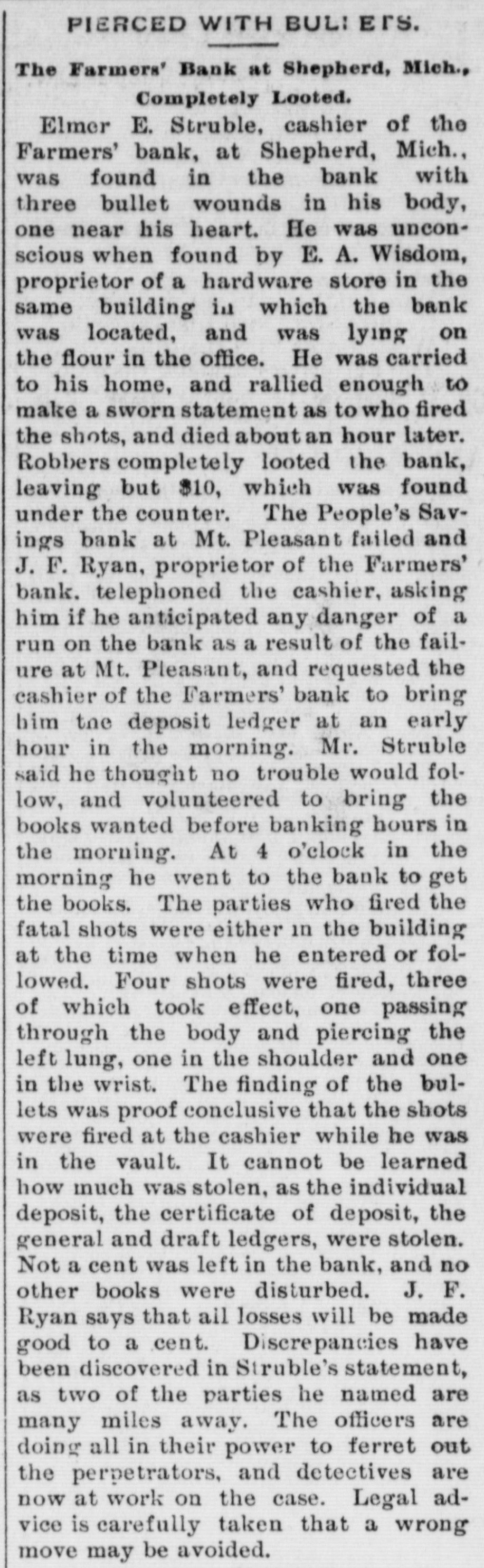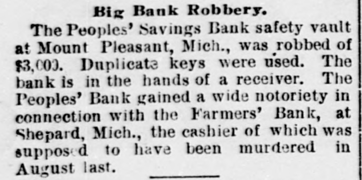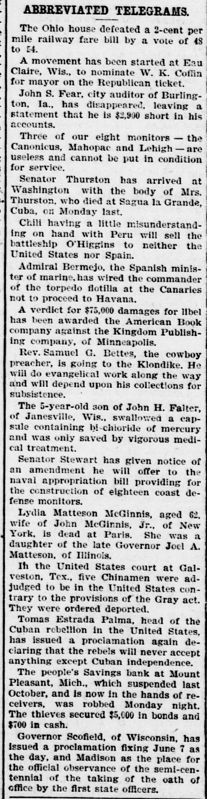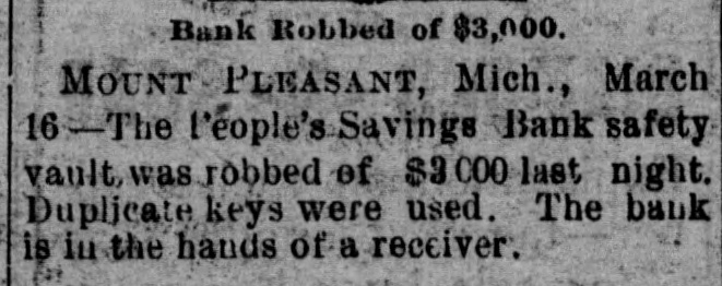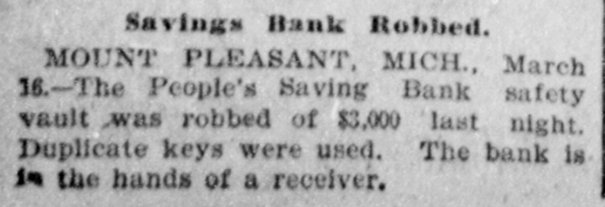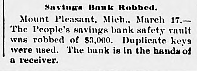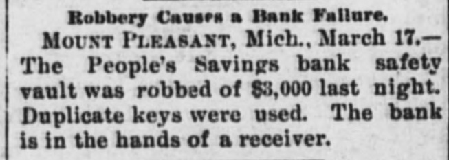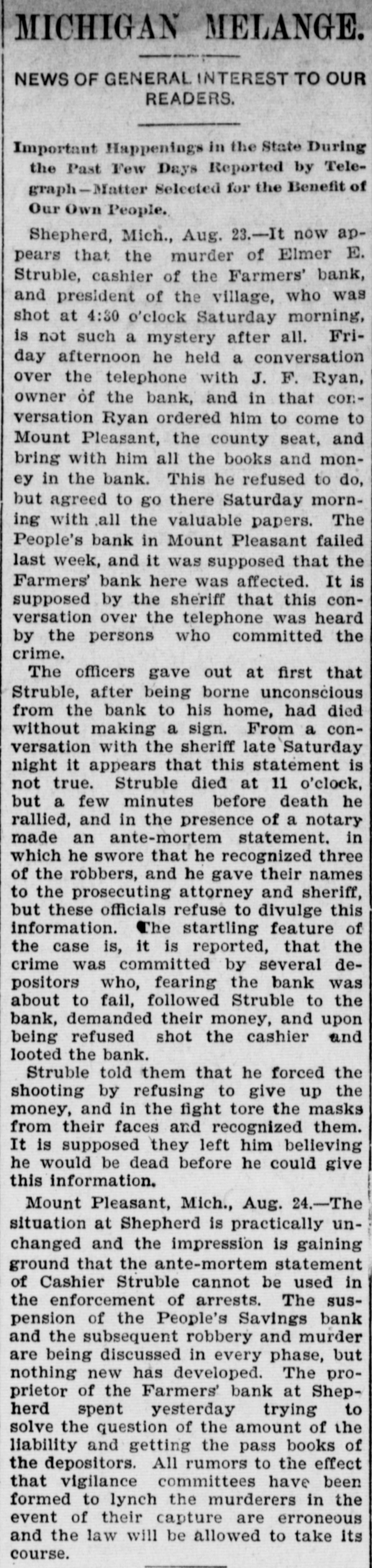 NEW YORK MINING STOCKS. Cholor $0 60 Ontario $3 00 Crown Point 53 15 Ophir Con. Cal. & Va 15 1 05 Plymouth Deadwood 1 00 95 Quicksilver 10 00 Gould & Curry 33 do pfd 50 Hale & Norcross. 90 Sierra Nevada Homestake 29 00 Standard 1 55 Iron Silver 32 30 Union Con. 28 Mexican 20 Yellow Jacket BOSTON MINING SHARES. 1 Allouez Min. Co Franklin 161/2 Atlantic 24 21 Kearsarge Boston & Mont Osceola 38 1437/8 118 Butte & Boston 275/8 Quincy Calumet & Hecla.415 Tamarack 135 Centennial 9 Wolverine 13 1/2 FOREIGN FINANCIAL. NEW YORK, Aug. 20.-Evening Post's London financial cablegram: The stock markets here were irregular today, with an improving tendency on the better news from India. Americans, however, closed flat in the street on the absence of New York support. Sales by recent purchasers here are not being pressed, but there will be no initiative for a rise until New York gives a fresh lead. The recovery in silver and silver stocks is regarded as comewhat artificial. Foreigners were better, a feature being the recovery in Brazils on improved exchange. Kaffirs were hard at the close, on reports in good quarters that Kruger is regarding the concessions more favorably. NEW YORK MONEY. NEW YORK, Aug. 20.-Money on call easy at 11/4@11/2 per cent; last loan, 11/4; close 11/4 per cent. Prime mercantile paper, 33/4@41/2 per cent. Sterling exchange, steady, with actual business in bankers' bills at $4.85% @4.853/4 for demand and at $4.831/@4.8334 for 60 days. Posted rates, $4.841/2@4.86, and $4.861/2@4.87. Commercial bills, $4.82. Silver certificates, 50@521/2c. Bar 523/c. silver, Mexican dollars, 401/2c. BRACE IN SILVER. NEW YORK, Aug. 20.-There was a sharp recovery in the price of silver today, bar silver opening in London at 241/2 pence, an advance of 7-16 of a penny. The opening price here for bar silver was 523/c, a rise of 3/4c. Mexican dollars were quoted this morning at 401/2c, against 397/80 yesterday. Yesterday's low level invited buying, which induced the recovery, but the market is reported rather weak at the rise. SAVINGS BANK SUSPENDS. MOUNT PLEASANT, Mich., Aug. 20.-The People's Savings bank, of this city, closed its doors this morning, and is now in the hands of the commissioner of banking. No statement has been given out. According to the last statement, made in January, the capital stock of the bank was $100,000, with $90,000 in deposits. George E. Newell is president, and C. A. Carnahan cashier. BANK CLEARINGS. St. Paul $669,812.84. Minneapolis, $1,157,268. Chicago, $14,845,336. New York. $98,897,744. Boston, $13,531,925. PRIVATE BANK FAILS. EUREKA, Utah., Aug. 20.-The private banking house of G. A. Rice has suspended payment on account of heavy withdrawals and inability to realize. The bank had on deposit about $30,000. CHICAGO MONEY. CHICAGO Aug. 20.-New York exchange, 40c discount. Sterling exchange, posted rates, $4.841/2 and $4.861/2. TREASURY STATEMENT. WASHINGTON. Aug. 20.-Today's statement of the condition of the treasury shows: Available cash, $220,915,183; gold reserve, $143,052,321.