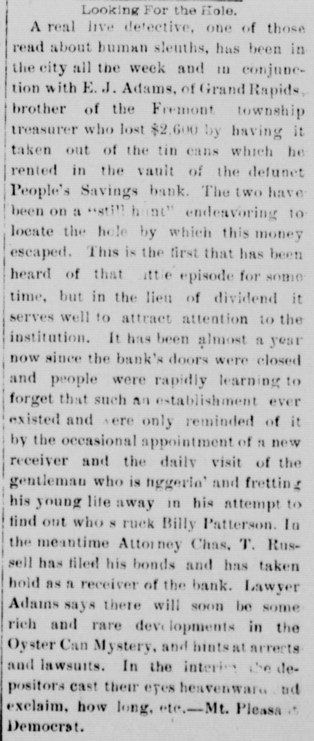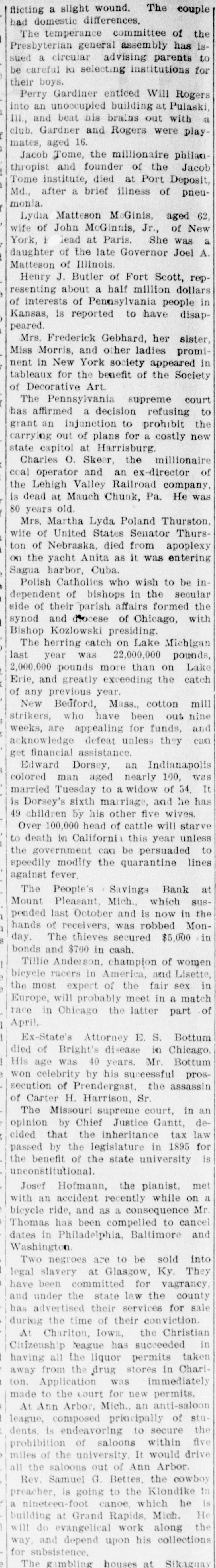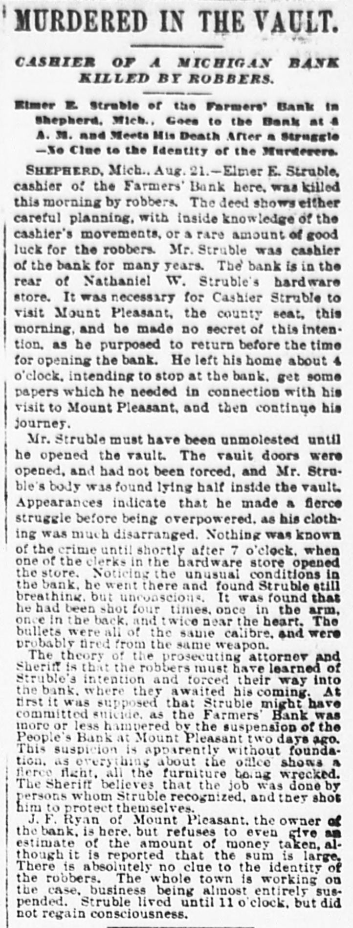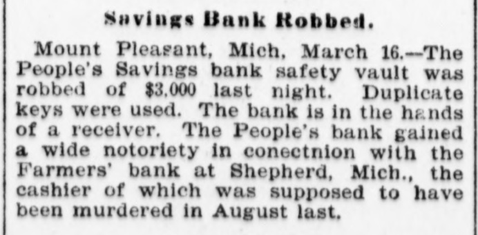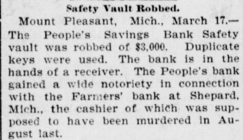 NEW YORK MINING STOCKS. Cholor $0 60 Ontario $3 00 Crown Point 53 15 Ophir Con. Cal. & Va 15 1 05 Plymouth Deadwood 1 00 95 Quicksilver 10 00 Gould & Curry 33 do pfd 50 Hale & Norcross. 90 Sierra Nevada Homestake 29 00 Standard 1 55 Iron Silver 32 30 Union Con. 28 Mexican 20 Yellow Jacket BOSTON MINING SHARES. 1 Allouez Min. Co Franklin 161/2 Atlantic 24 21 Kearsarge Boston & Mont Osceola 38 1437/8 118 Butte & Boston 275/8 Quincy Calumet & Hecla.415 Tamarack 135 Centennial 9 Wolverine 13 1/2 FOREIGN FINANCIAL. NEW YORK, Aug. 20.-Evening Post's London financial cablegram: The stock markets here were irregular today, with an improving tendency on the better news from India. Americans, however, closed flat in the street on the absence of New York support. Sales by recent purchasers here are not being pressed, but there will be no initiative for a rise until New York gives a fresh lead. The recovery in silver and silver stocks is regarded as comewhat artificial. Foreigners were better, a feature being the recovery in Brazils on improved exchange. Kaffirs were hard at the close, on reports in good quarters that Kruger is regarding the concessions more favorably. NEW YORK MONEY. NEW YORK, Aug. 20.-Money on call easy at 11/4@11/2 per cent; last loan, 11/4; close 11/4 per cent. Prime mercantile paper, 33/4@41/2 per cent. Sterling exchange, steady, with actual business in bankers' bills at $4.85% @4.853/4 for demand and at $4.831/@4.8334 for 60 days. Posted rates, $4.841/2@4.86, and $4.861/2@4.87. Commercial bills, $4.82. Silver certificates, 50@521/2c. Bar 523/c. silver, Mexican dollars, 401/2c. BRACE IN SILVER. NEW YORK, Aug. 20.-There was a sharp recovery in the price of silver today, bar silver opening in London at 241/2 pence, an advance of 7-16 of a penny. The opening price here for bar silver was 523/c, a rise of 3/4c. Mexican dollars were quoted this morning at 401/2c, against 397/80 yesterday. Yesterday's low level invited buying, which induced the recovery, but the market is reported rather weak at the rise. SAVINGS BANK SUSPENDS. MOUNT PLEASANT, Mich., Aug. 20.-The People's Savings bank, of this city, closed its doors this morning, and is now in the hands of the commissioner of banking. No statement has been given out. According to the last statement, made in January, the capital stock of the bank was $100,000, with $90,000 in deposits. George E. Newell is president, and C. A. Carnahan cashier. BANK CLEARINGS. St. Paul $669,812.84. Minneapolis, $1,157,268. Chicago, $14,845,336. New York. $98,897,744. Boston, $13,531,925. PRIVATE BANK FAILS. EUREKA, Utah., Aug. 20.-The private banking house of G. A. Rice has suspended payment on account of heavy withdrawals and inability to realize. The bank had on deposit about $30,000. CHICAGO MONEY. CHICAGO Aug. 20.-New York exchange, 40c discount. Sterling exchange, posted rates, $4.841/2 and $4.861/2. TREASURY STATEMENT. WASHINGTON. Aug. 20.-Today's statement of the condition of the treasury shows: Available cash, $220,915,183; gold reserve, $143,052,321.