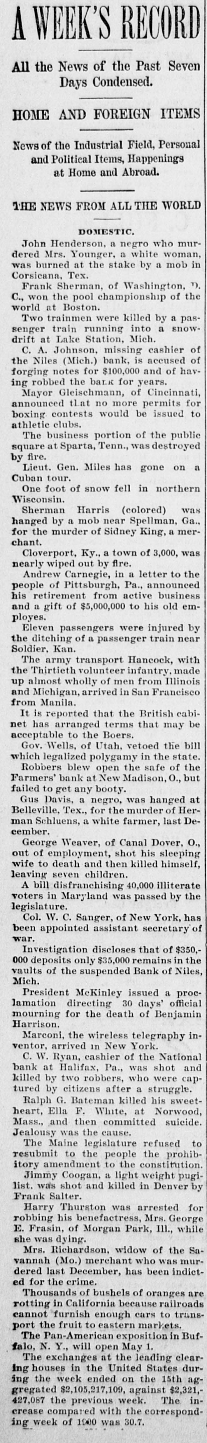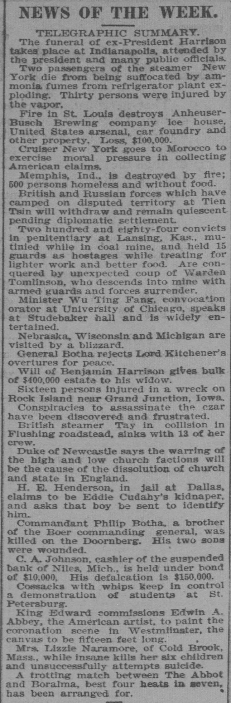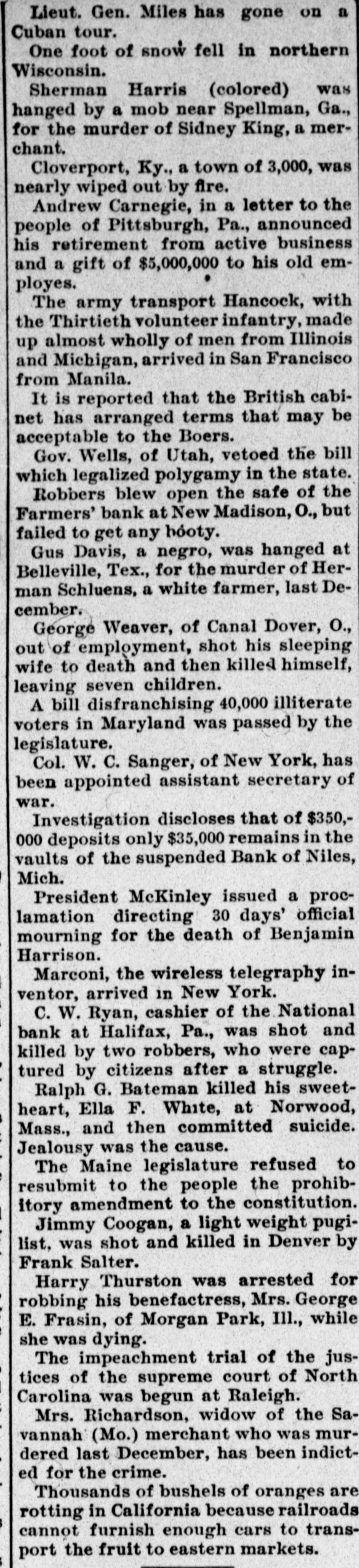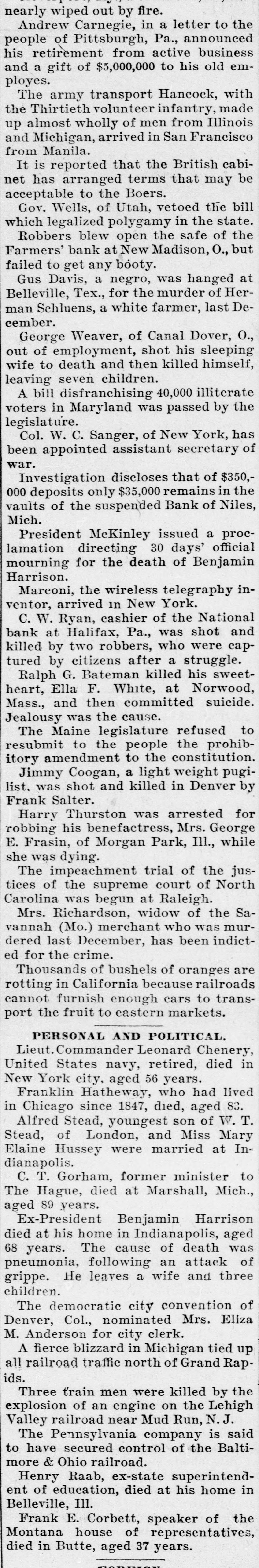 nearly wiped out by fire. Andrew Carnegie, in a letter to the people of Pittsburgh, Pa., announced his retirement from active business and a gift of $5,000,000 to his old employes. The army transport Hancock, with the Thirtieth volunteer infantry, made up almost wholly of men from Illinois and Michigan, arrived in San Francisco from Manila. It is reported that the British cabinet has arranged terms that may be acceptable to the Boers. Gov. Wells, of Utah, vetoed the bill which legalized polygamy in the state. Robbers blew open the safe of the Farmers' bank at New Madison, O., but failed to get any booty. Gus Davis, a negro, was hanged at Belleville, Tex., for the murder of Herman Schluens, a white farmer, last December. George Weaver, of Canal Dover, O., out of employment, shot his sleeping wife to death and then killed himself, leaving seven children. A bill disfranchising 40,000 illiterate voters in Maryland was passed by the legislature. Col. W. C. Sanger, of New York, has been appointed assistant secretary of war. Investigation discloses that of $350,000 deposits only $35,000 remains in the vaults of the suspended Bank of Niles, Mich. President McKinley issued a proclamation directing 30 days' official mourning for the death of Benjamin Harrison. Marconi, the wireless telegraphy inventor, arrived in New York. C. W. Ryan, cashier of the National bank at Halifax, Pa., was shot and killed by two robbers, who were captured by citizens after a struggle. Ralph G. Bateman killed his sweetheart, Ella F. White, at Norwood, Mass., and then committed suicide. Jealousy was the cause. The Maine legislature refused to resubmit to the people the prohibitory amendment to the constitution. Jimmy Coogan, a light weight pugilist, was shot and killed in Denver by Frank Salter. Harry Thurston was arrested for robbing his benefactress, Mrs. George E. Frasin, of Morgan Park, Ill., while she was dying. The impeachment trial of the justices of the supreme court of North Carolina was begun at Raleigh. Mrs. Richardson, widow of the Savannah (Mo.) merchant who was murdered last December, has been indicted for the crime. Thousands of bushels of oranges are rotting in California because railroads cannot furnish enough cars to transport the fruit to eastern markets. # PERSONAL AND POLITICAL. Lieut. Commander Leonard Chenery, United States navy, retired, died in New York city, aged 56 years. Franklin Hatheway, who had lived in Chicago since 1847, died, aged 83. Alfred Stead, youngest son of W. T. Stead, of London, and Miss Mary Elaine Hussey were married at Indianapolis. C. T. Gorham, former minister to The Hague, died at Marshall, Mich., aged 89 years. Ex-President Benjamin Harrison died at his home in Indianapolis, aged 68 years. The cause of death was pneumonia, following an attack of grippe. He leaves a wife and three children. The democratic city convention of Denver, Col., nominated Mrs. Eliza M. Anderson for city clerk. A fierce blizzard in Michigan tied up all railroad traffic north of Grand Rapids. Three train men were killed by the explosion of an engine on the Lehigh Valley railroad near Mud Run, N. J. The Pennsylvania company is said to have secured control of the Baltimore & Ohio railroad. Henry Raab, ex-state superintendent of education, died at his home in Belleville, Ill. Frank E. Corbett, speaker of the Montana house of representatives, died in Butte, aged 37 years.