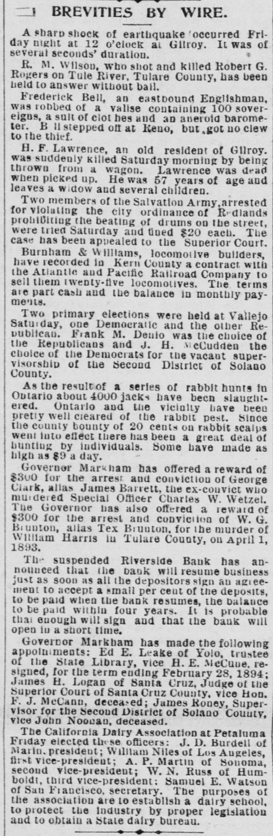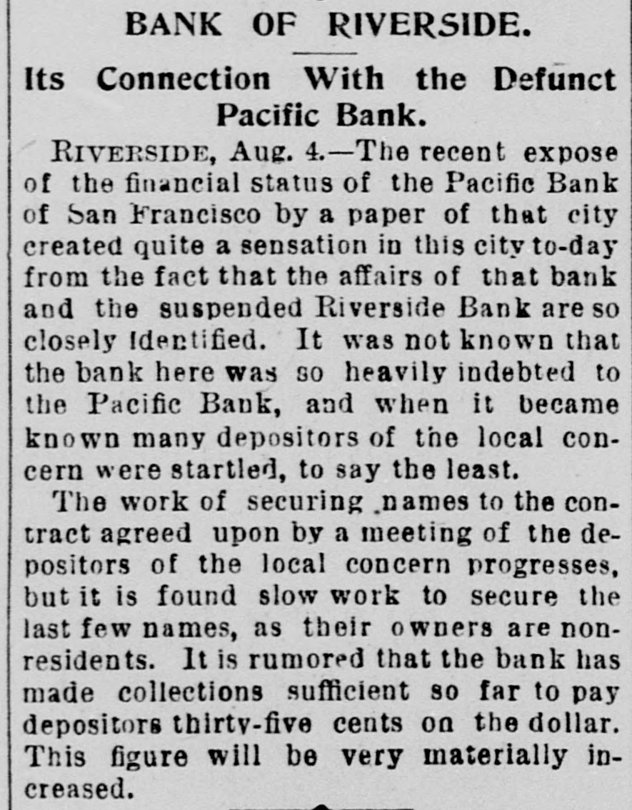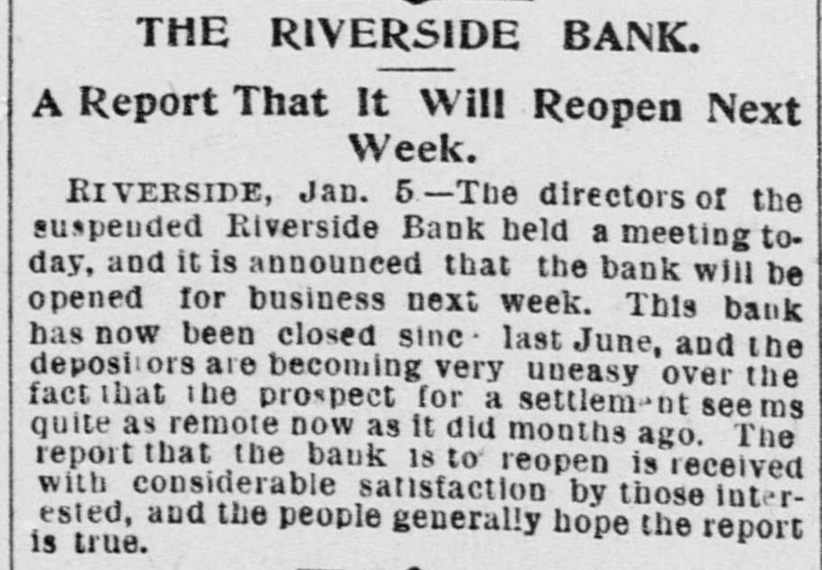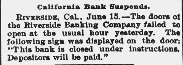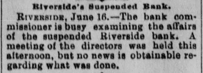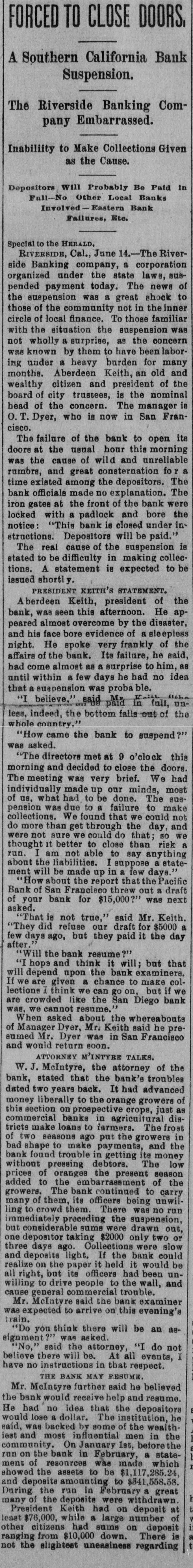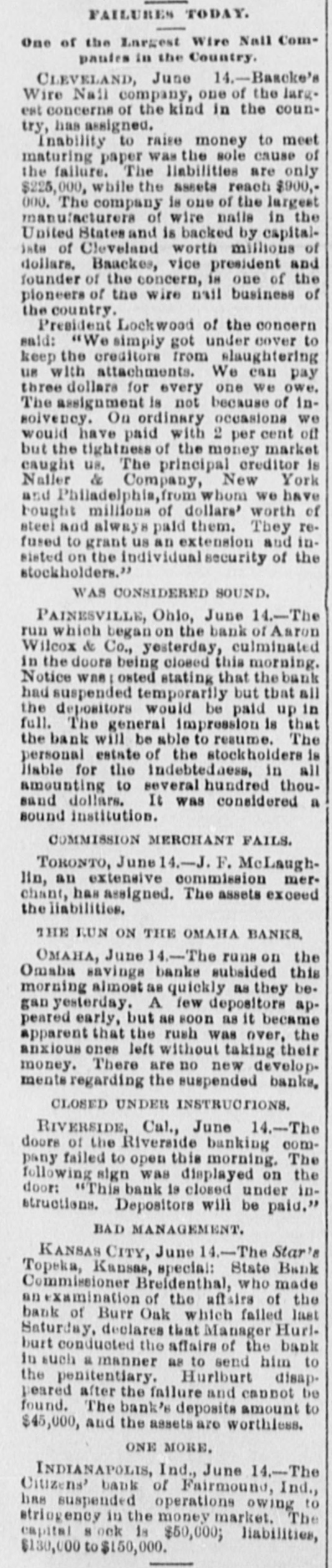 FAILURES TODAY. One of the Largest Wire Nall Compaules in the Country. CLEVELAND, June 14.-Bancke's Wire Nail company, one of the largest concerns of the kind in the country, has assigned. Inability to raise money to meet maturing paper was the sole cause of the failure. The liabilities are only $225,000, while the assets reach $900,000. The company is one of the largest manufacturers of wire natis in the United States and is backed by capitalinto of Cleveland worth millions of dollars. Baackes, vice president and founder of the concern, 18 one of the pioneers of the wire nail business of the country. President Lockwood of the concern said: "We simply got under cover to keep the creditors from slaughtering us with attachments. We can pay three dollars for every one we owe. The assignment is not because of insolvency. On ordinary occasions we would have paid with 2 per cent off but the tightness of the money market caught us. The principal creditor is Natler & Company, New York and Philadelphia,from whom we have bought millions of dollars' worth of steel and always paid them. They refused to grant us an extension and insisted on the individual security of the stockholders." WAS CONSIDERED SOUND. PAINESVILLE, Ohio, June 14.-The which began on the bank of Aaron Wilcox & Co., yesterday, culminated in the doors being closed this morning. Notice was I osted stating that thebank had suspended temporarily but that all the depositors would be paid up in full. The general impression is that the bank will be able to resume. The personal estate of the stockholders is liable for the indebtedness, in all amounting to several hundred thousand dollars. It was considered a sound institution. COMMISSION MERCHANT FAILS. TORONTO, June 14.-J. F. McLaughlin, an extensive commission merchant, has assigned. The assets exceed the liabilities. THE RUN ON THE OMAHA BANKS OMAHA, June 14.-The runs on the Omaba savings banks subsided this morning almost as quickly as they be. gan yesterday. A few depositors appeared early, but as soon as it became apparent that the rush was over, the anxious ones left without taking their money. There are no new developments regarding the suspended banks. CLOSED UNDER INSTRUCTIONS. RIVERSIDE, Cal., June 14.-The doors of the Riverside banking company failed to open this morning. The following sign was displayed on the door: "This bank is closed under instructions. Depositors will be paid." BAD MANAGEMENT. KANSAS CITY, June 14.-The Star's Topeka, Kansas, special: State Bank Commissioner Breidenthal, who made enexamination of the affairs of the bank of Burr Oak which falled last Saturday, declares that Manager Hurl. burt conducted the affairs of the bank in such a manner as to send him to the penitentiary. Hurlburt disap. peared after the failure and cannot be found. The bank's deposits amount to $45,000, and the assets are worthless. ONE MORE. INDIANAPOLIS, Ind., June 14.-The Citizens' bank of Fairmound, Ind., has suspended operations owing to stringency in the money market. The capital 8 ock is $50,000; liabilities, $130,000 to $150,000.