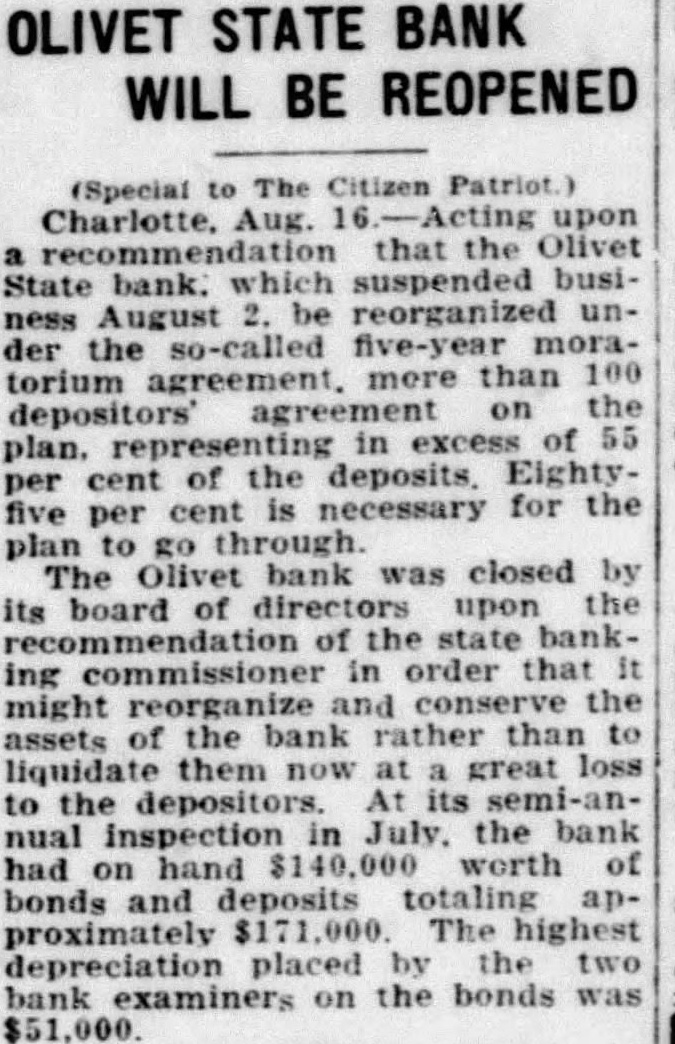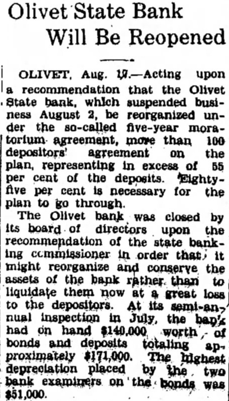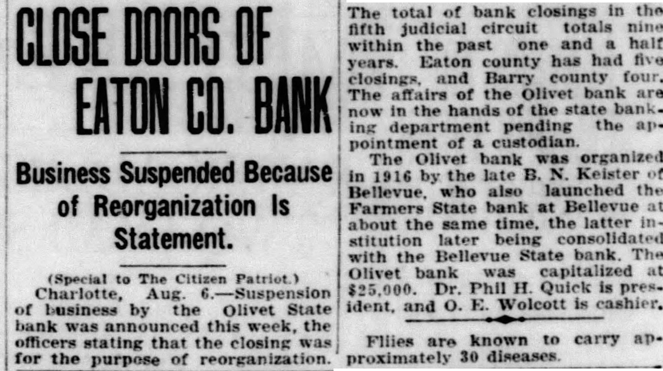CLOSE DOORS OF EATON CO. BANK Business Suspended Because of Reorganization Is Statement. (Special to The Citizen by the Olivet bank this week, officers stating that for the purpose The total of bank in fifth judicial circuit totals within the Eaton county Barry The affairs of the Olivet bank in the hands the pending the of The Olivet bank organized by Keister Bellevue, Farmers State bank at Bellevue about the same the latter the Bellevue bank. The Olivet bank capitalized Dr. Phil Quick is and O. E. Wolcott is known 30