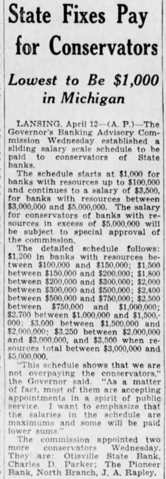 State Fixes Pay for Conservators Lowest to Be $1,000 in Michigan LANSING April Governor's mission Wednesday established sliding salary schedule to be paid to conservators of State banks. The schedule starts at for banks with resources up to and continues to salary $3,500. for banks between $3,000,000 and The salary for of in of $5,000,000 will subject special approval of the detailed schedule follows: banks tween $100,000 and between and $200,000; between between $300,000 $500,000 between $500,000 $750,000 and and $3,000 and and and when total $3,000,000 and schedule shows that are not overpaying the Governor matter fact. most of are accepting spirit public service that the salaries the maximums and some will be paid lower sums commission appointed two more Otisville State Bank Charles Parker: The Pioneer Bank, North Branch, Rapley.