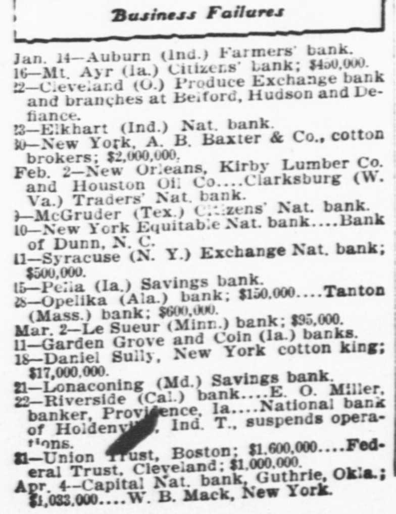 Business Failures Jan. 14-Auburn (Ind.) Farmers' bank. 16-Mt. Ayr (Ia.) Citizens' bank; $450,000. 22-Cleveland (0.) Produce Exchange bank and branches st Belford, Hudson and Defiance. 23-Elkhart (Ind.) Nat. bank. 30-New York, A. B. Baxter & Co., cotton brokers; $2,000,000. Feb. 2-New Orleans, Kirby Lumber Co. and Houston Oil Co Clarksburg (W. Va.) Traders' Nat. bank. 1-McGruder (Tex.) Citizens' Nat. bank. Id-New York Equitable Nat. bank Bank of Dunn, N. C. 11-Syracuse (N. Y.) Exchange Nat. bank; $500,000. 15-Pella (Ia.) Savings bank. 28-Opelika (Ala.) bank; $150,000 Tanton (Mass.) bank; $600,000. Mar. 2-Le Sueur (Minn.) bank; $95,000. 11-Garden Grove and Coin (Ia.) banks. 18-Daniel Sully, New York cotton king; 21-Lonaconing $17,000,000. (Md.) Savings bank. 22-Riverside (Cal.) bank E. O. Miller, banker, Providence, Ia National bank of Holdenville, Ind. T., suspends operaHons. 1-Union Trust, Boston; $1,600,000 Federal Trust, Cleveland; $1,000,000. Apr. 4--Capital Nat. bank, Guthrie, Okla.; $1,033,000 W. B. Mack, New York.