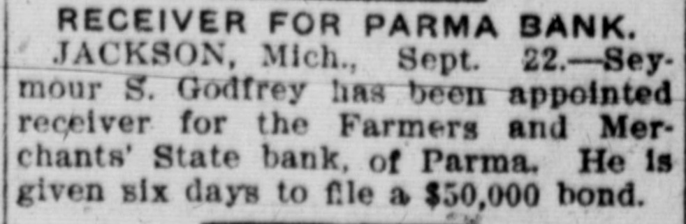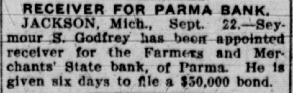 RECEIVER FOR PARMA BANK. JACKSON, Mich., Sept. 22.Seymour S. Godfrey has been appointed receiver for the Farmers and Merchants' State bank, of Parma. He is given six days to file a $50,000 bond.