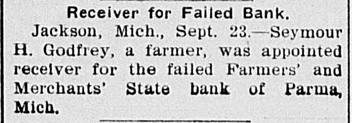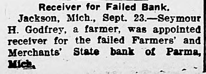 Receiver for Failed Bank. Jackson, Mich., Sept. 23.-Seymour H. Godfrey, a farmer, was appointed receiver for the failed Farmers' and Merchants' State bank of Parma, Mich.