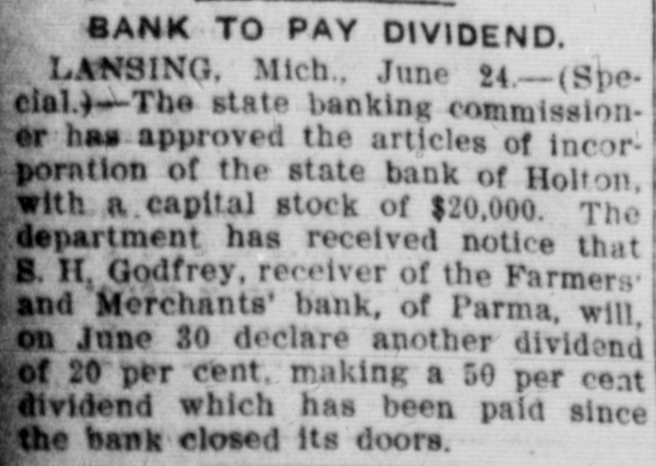 BANK TO PAY DIVIDEND. LANSING, Mich., June 24.-(Special.)-The state banking commission- er has approved the articles of incor- poration of the state bank of Holton, with a capital stock of $20,000. The department has received notice that S. H. Godfrey, receiver of the Farmers' and Merchants' bank, of Parma, will, on June 30 declare another dividend of 20 per cent, making a 50 per cent dividend which has been paid since the bank closed its doors.