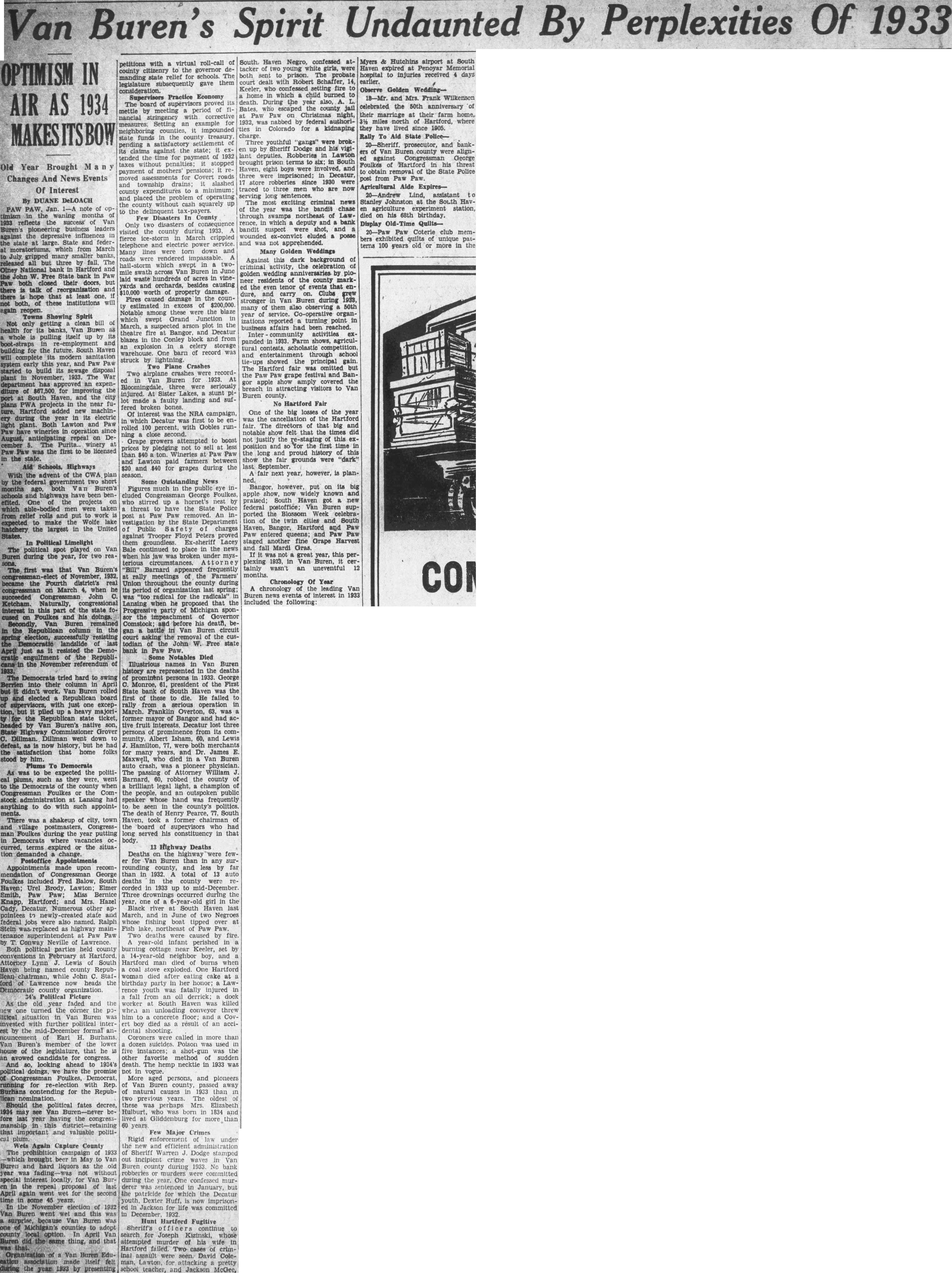 In Political Limelight The political spot played on Van Buren during the year, for two reasons. The first was that Van Buren's of November, 1932, became the Fourth district's real congressman on March 4, when he succeeded Congressman John Ketcham. Naturally, congressional interest in this part of the state focused on Foulkes and his doings. Secondly, Van Buren remained in the Republican column in the spring election, successfully resisting the Democratic landslide of last April just as it resisted the Democratic engulfment of the Republicans the November referendum of 1933. The Democrats tried hard to swing Berrien into their column in April but it didn't work. Van Buren rolled up and elected Republican board supervisors, with just one exception, but piled up heavy majorithe Republican state ticket, headed by Van Buren's native son, State Highway Commissioner Grover C. Dillman. Dillman went down to defeat, as is now history, but he had the satisfaction that home folks stood by him. Plums To Democrats As was to be expected the political plums, such as they were, went to the Democrats of the county when Congressman Foulkes or the Comstock administration at Lansing had anything to do with such appointments. There was shakeup of city, town and village postmasters, Congressman Foulkes during the year putting in Democrats where vacancies OCcurred, terms expired or the situation demanded change. Postoffice Appointments Appointments made upon recommendation of Congressman George Foulkes included Fred Balow, South Haven: Urel Brody, Lawton; Elmer Smith, Paw Paw; Miss Bernice Knapp, Hartford; and Mrs. Hazel Cady, Decatur. Numerous other ap pointees to state and federal jobs were also named. Ralph Stein was replaced as highway maintenance at Paw Paw by Conway Neville of Lawrence. Both political parties held county conventions in February at Hartford. Attorney Lynn Lewis of South Haven being named county Repubchairman, while John C. Stafford of Lawrence now heads the Democratic county organization. 34's Political Picture As the old year faded and the new one turned the corner the political situation in Van Buren was invested with further political interest by the mid December formal anof Earl H. Burhans. Van Buren's member of the lower house of the legislature, that he is an candidate for congress. And so, looking ahead to 1934's political doings, have the promise Congressman Foulkes, Democrat, running for re-election with Rep. Burhans contending for the Republican nomination. Should the political fates decree, 1934 may Van before last year having the congress manship in this that important and valuable political plum. Wets Again Capture County The prohibition campaign of 1933 -which brought beer in May to Van Buren and hard liquors as the old year was fading-was not without special interest locally, for Van Buren in the repeal proposal of last April again went wet for the second time in some 45 years. In the November election of 1932 Van Buren went wet and this was surprise, because Van Buren was one of Michigan's counties to adopt county local option. In April Van Buren did the same thing, and that was that. Organization of Van Buren Edu. cation association Itself felt during the year 1933 by presenting petitions with virtual roll-call of county citizenry to the governor demanding state relief for schools. The legislature subsequently gave them consideration. Supervisors Practice Economy The board of supervisors proved its mettle by meeting period of nancial stringency with corrective measures. Setting an example for neighboring counties, it impounded state funds in the county treasury, pending satisfactory settlement of its claims against the state; it extended the time for payment of 1932 taxes without penalties; it stopped payment of mothers' pensions; it removed assessments for Covert roads and township drains; slashed county expenditures to minimum; and placed the problem of operating the county without cash squarely up to the delinquent payers. Few Disasters In County Only two disasters of consequence visited the county during 1933. fierce ice-storm in March crippled telephone and electric power service. Many lines were down and roads were rendered impassable. A hail-storm which swept in a twomile swath across Van Buren in June laid waste hundreds of acres in vineyards and orchards, besides causing $10,000 worth of property damage. Fires caused damage in the ty estimated in excess of $200,000 Notable among these were the blaze which swept Grand Junction in March, arson plot in the theatre fire at Bangor, and Decatur blazes in the Conley block and from an explosion in celery storage warehouse. One barn of record was struck by lightning. Two Plane Crashes Two airplane crashes were recorded in Van Buren for 1933. At three were seriously injured. At Sister Lakes, stunt pllot made faulty landing and suffered broken bones. Of interest was the NRA campaign, in which Decatur was first to be enrolled 100 percent, with Gobles running close second. Grape growers attempted to boost prices by pledging not to sell at less than $40 ton. Wineries at Paw Paw and Lawton paid farmers between $20 and $40 for grapes during the season.