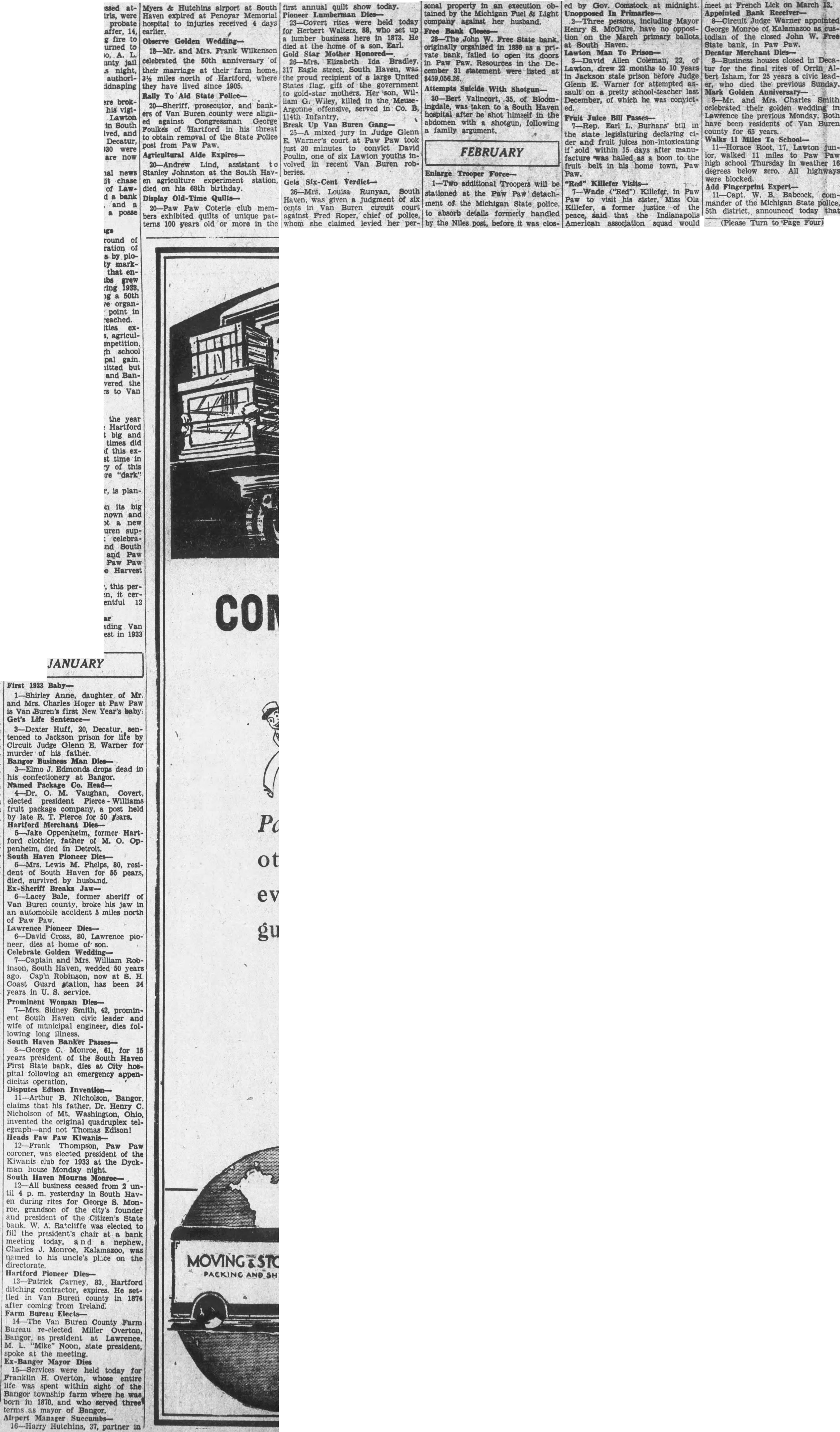 Some Outstanding News Figures much in the public eye included George Foulkes, who stirred up hornet's nest by threat to have the State Police post at Paw Paw removed. An investigation by the State Department Public of charges against Trooper Floyd Peters proved them groundless. Ex-sheriff Lacey Bale continued to place in the news when his jaw was broken under mysterious circumstances. "Bill" Barnard appeared frequently rally meetings of the Farmers Union throughout the county during its period of organization last spring; was "too radical for the radicals" Lansing when he proposed that the Progressive party of Michigan sponsor the of Governor Comstock; and before his death, began battle in Van Buren circuit court asking the removal of the custodian of the John W. Free state bank in Paw Paw. Some Notables Died Illustrious names in Van Buren history are represented in the deaths of prominent persons 1933. George Monroe, 61, president of the First State bank of South Haven was the first of these to die. He failed rally from serious operation in March. Franklin Overton, 63, was former mayor of Bangor and had active fruit interests. Decatur lost three persons of prominence from its community. Albert Isham, 60, and Lewis Hamilton, 77, were both merchants for many years, and Dr. James E. Maxwell, who died in Van Buren auto crash, was pioneer physician. The passing Attorney William Barnard, robbed the county of brilliant legal light, champion the people, and an outspoken public speaker whose hand was frequently be seen the county's politics. The death Henry Pearce, 77. South Haven, took former chairman the board of supervisors who had long served his constituency in that body.