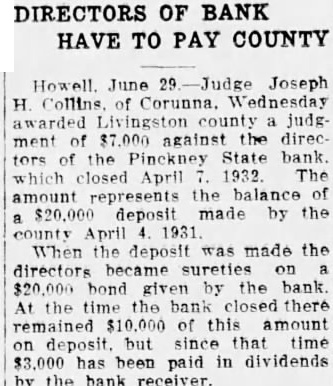 DIRECTORS OF BANK HAVE TO PAY COUNTY Howell June 29 Judge Joseph H Collins of Corunna. Wednesday awarded Livingston county a judgment of $7,000 against the direc. tors of the Pinckney State bank. which closed April 1932. The amount represents the balance of a $20,000 deposit made by the county April 1931. When the deposit was made the directors became sureties on $20,000 bond given by the bank At the time the bank closed there remained $10,000 of this amount on deposit. but since that time $3,000 has been paid in dividends by the bank receiver.