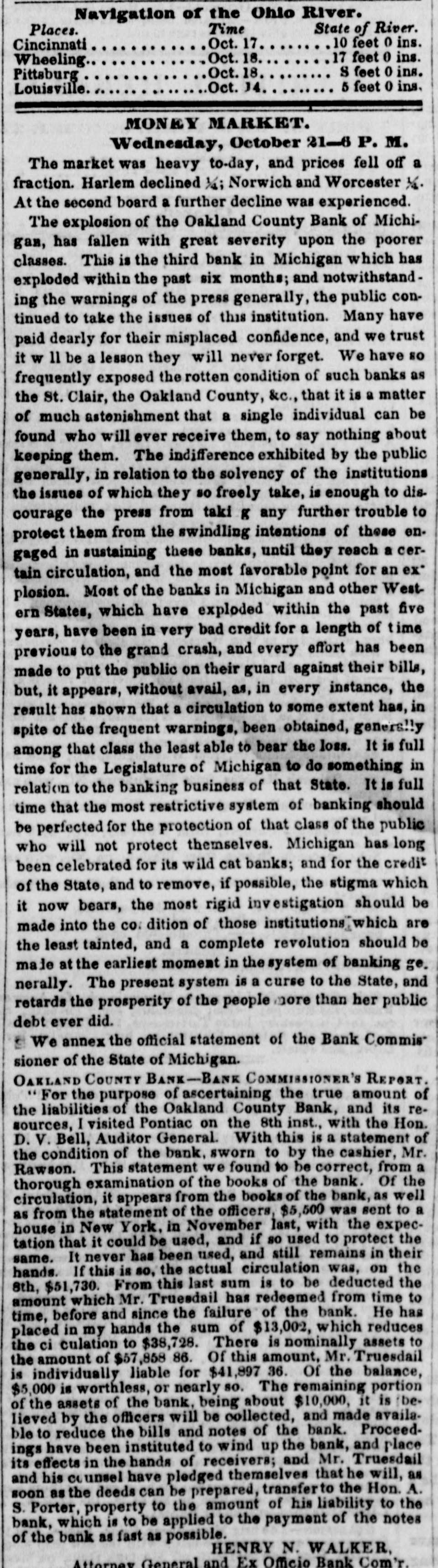 Navigation of the Ohio River. Time State of River. Places. 10 feet 0 ins. Oct. Cincinnati 17 feet 0 ins. Oct. 18. Wheeling S feet 0 ins. Oct. 18 Pittsburg 5 feet 0 ins. Oct. 14 Louisville. MONEY MARKET. Wednesday, October 21-6 P. M. The market was heavy to-day, and prices fell off a fraction. Harlem declined 1/4; Norwich and Worcester 1/4. At the second board a further decline was experienced. The explosion of the Oakland County Bank of Michigan, has fallen with great severity upon the poorer classes. This is the third bank in Michigan which has exploded within the past six months; and notwithstand ing the warnings of the press generally, the public continued to take the issues of this institution. Many have paid dearly for their misplaced confidence, and we trust it W 11 be a lesson they will never forget. We have so frequently exposed the rotten condition of such banks as the St. Clair, the Oakland County, &c., that it is a matter of much astenishment that a single individual can be found who will ever receive them, to say nothing about keeping them. The indifference exhibited by the public generally, in relation to the solvency of the institutions the issues of which they so freely take, is enough to discourage the press from taki g any further trouble to protect them from the swindling intentions of these engaged in sustaining these banks, until they reach a certain circulation, and the most favorable point for an ex" plosion. Most of the banks in Michigan and other West ern States, which have exploded within the past five years, have been in very bad credit for a length of time previous to the grand crash, and every effort has been made to put the public on their guard against their bills, but, it appears, without avail, as, in every instance, the result has shown that a circulation to some extent has, in spite of the frequent warnings, been obtained, generally among that class the least able to bear the loss. It is full time for the Legislature of Michigan to do something in relation to the banking business of that State. It is full time that the most restrictive system of banking should be perfected for the protection of that class of the public who will not protect themselves. Michigan has long been celebrated for its wild cat banks; and for the credit of the State, and to remove, if possible, the stigma which it now bears, the most rigid estigation should be made into the CO. dition of those institutions™ which are the least tainted, and a complete revolution should be male at the earliest moment in the system of banking ge. nerally. The present system is a curse to the State, and retards the prosperity of the people more than her public debt ever did. E We annex the official statement of the Bank Commis sioner of the State of Michigan. OAKLAND COUNTY BANK-BANK COMMISSIONER'S REPORT. For the purpose of ascertaining the true amount of the liabilities of the Oakland County Bank, and its resources, I visited Pontiac on the 8th inst., with the Hon. D.V. Bell, Auditor General. With this is a statement of the condition of the bank, sworn to by the cashier, Mr. Rawson. This statement we found to be correct, from a thorough examination of the books of the bank. Of the circulation, it appears from the books of the bank, as well as from the statement of the officers, $5,500 was sent to a house in New York, in November last, with the expectation that it could be used, and if so used to protect the same. It never has been used, and still remains in their hands. If this is so, the actual circulation was. on the 8th, $51,730. From this last sum is to be deducted the amount which Mr. Truesdail has redeemed from time to time, before and since the failure of the bank. He has placed in my hands the sum of $13,002, which reduces the ci culation to $38,728. There is nominally assets to the amount of $57,858 86. Of this amount, Mr. Truesdail is individually liable for $41,897 36. Of the balance, $5,000 is worthless, or nearly so. The remaining portion of the assets of the bank, being about $10,000, it is believed by the officers will be collected, and made availa. ble to reduce the bills and notes of the bank. Proceed. ings have been instituted to wind up the bank, and place its effects in the hands of receivers; and Mr. Truesdail and his counsel have pledged themselves that he will, as soon as the deeds can be prepared, transfer to the Hon. A. S. Porter, property to the amount of his liability to the bank, which is to be applied to the payment of the notes of the bank as fast as possible. HENRY N. WALKER, Attorney and Ex Officio Bank Com'r.