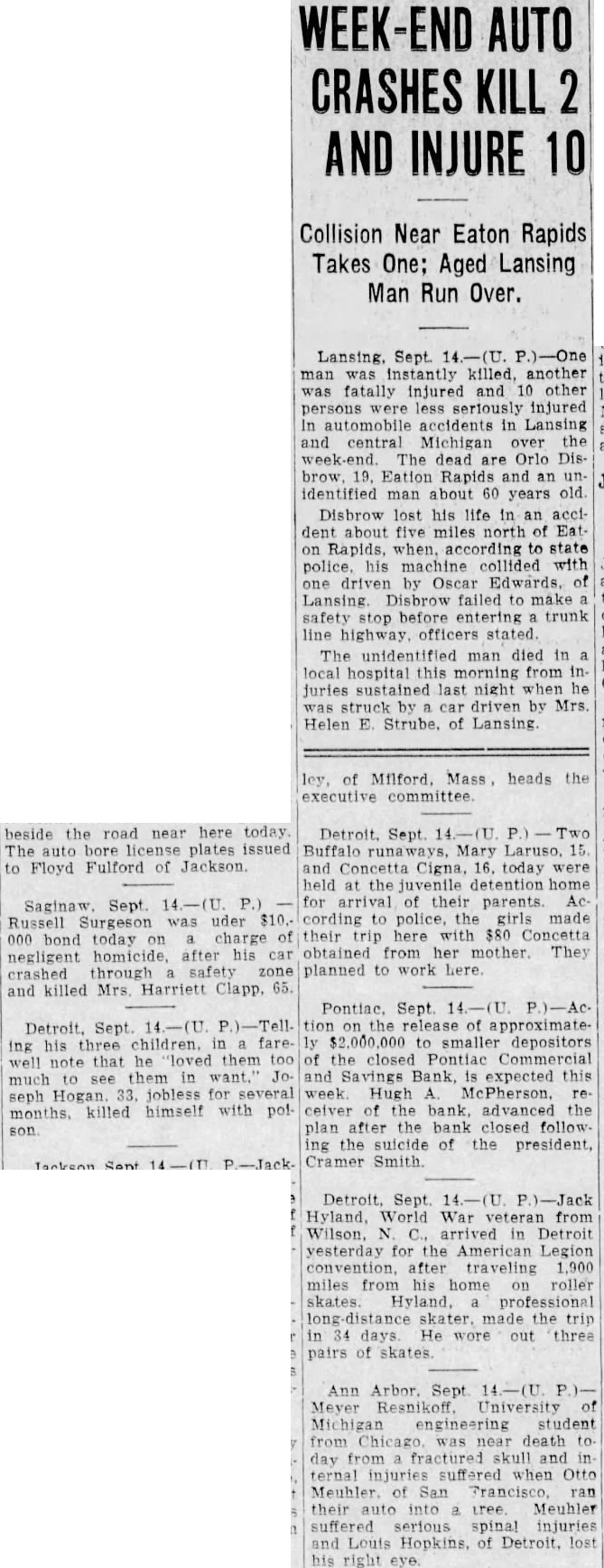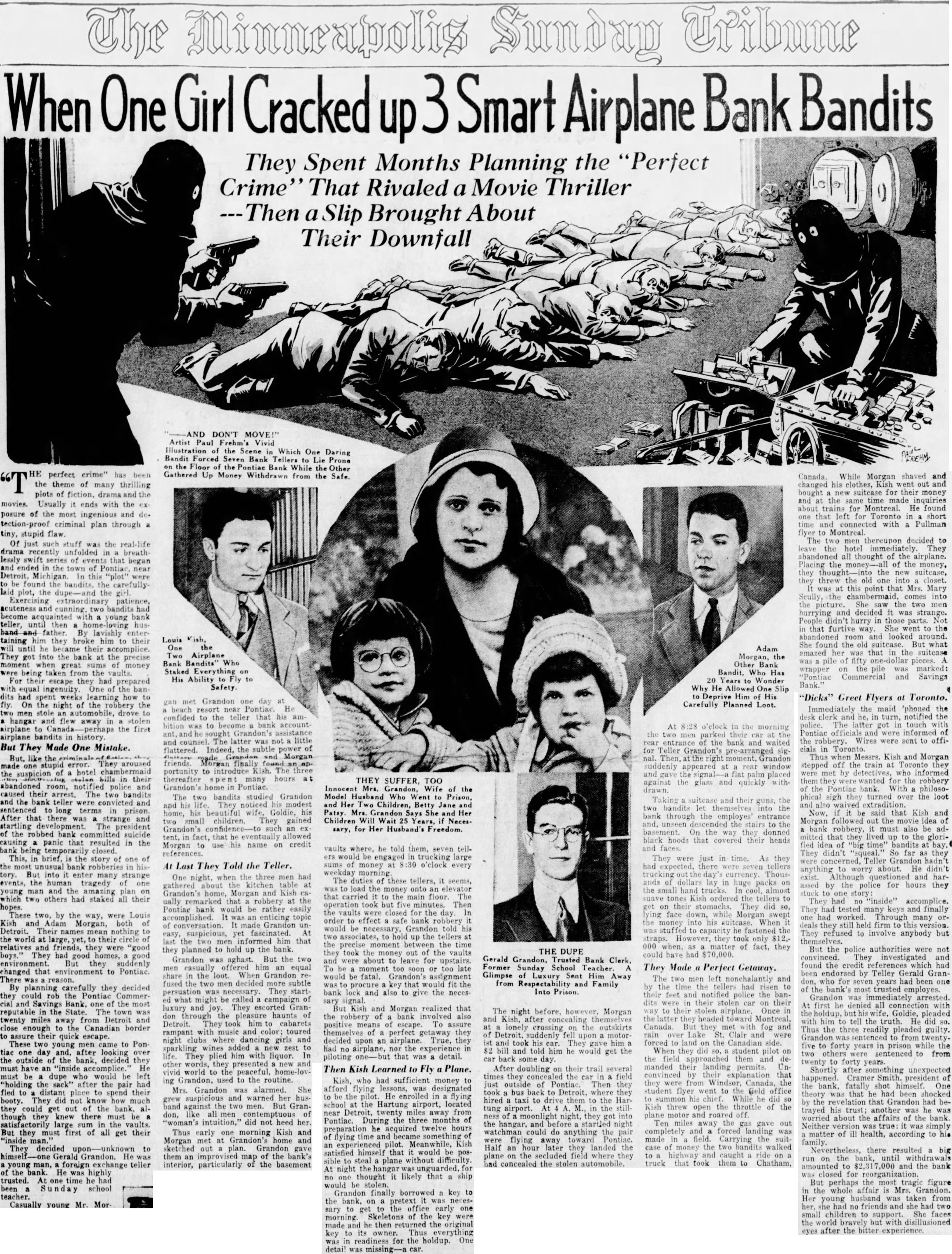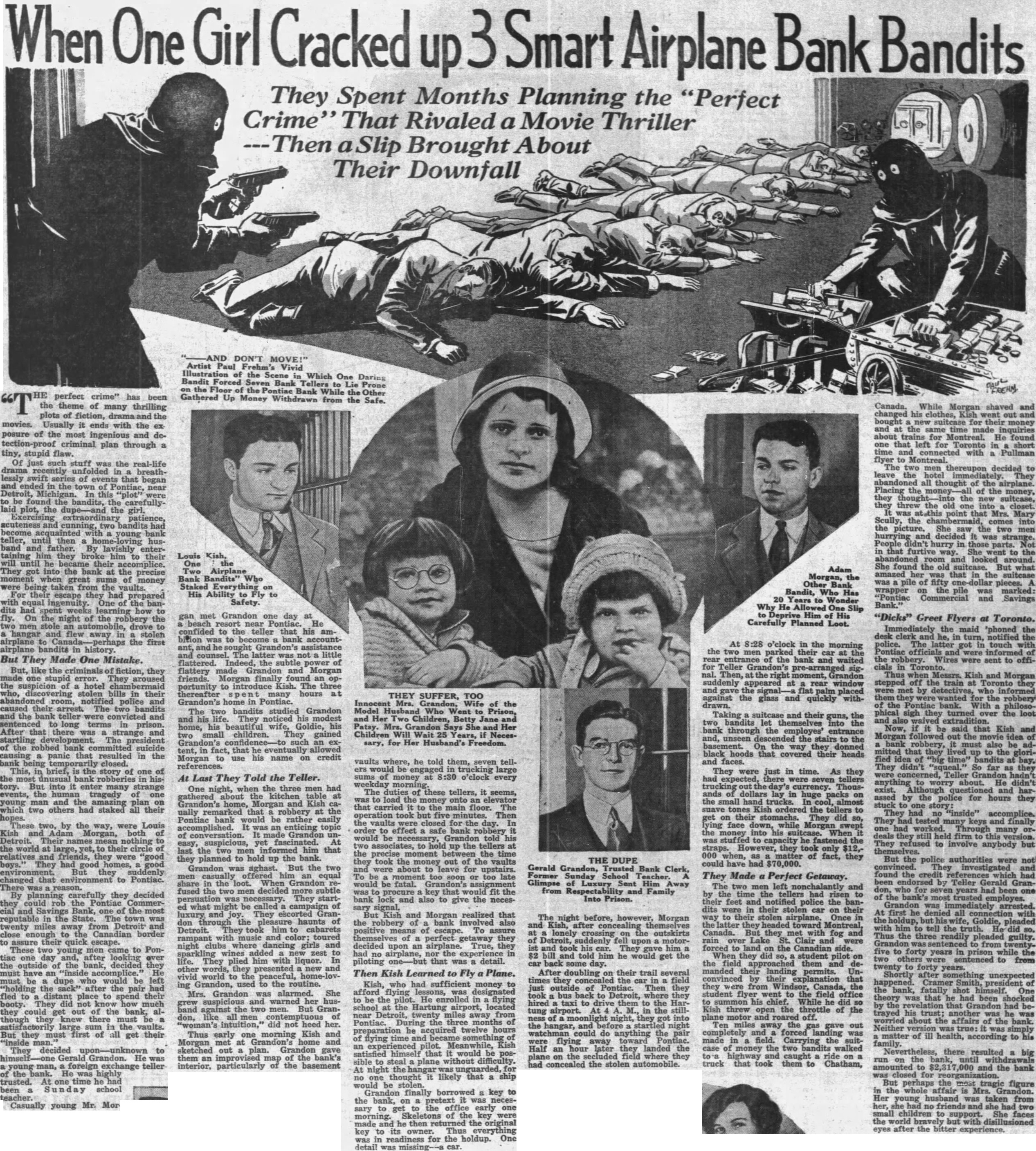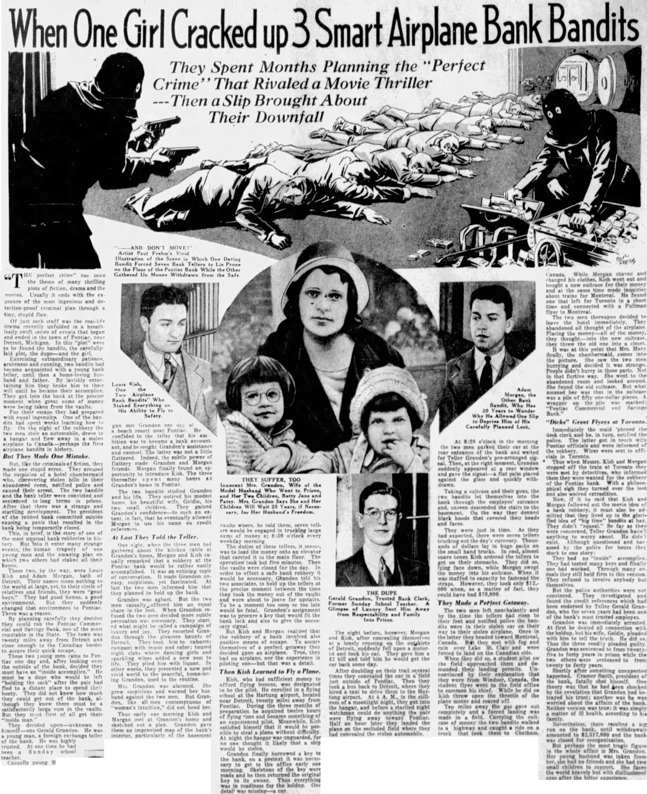 perfect crime" has been the theme of many thrilling plots of fiction, drama and the movies. Usually it ends with the exposure of the most ingenious and detection-proof criminal plan through a tiny, stupid flaw. Of just such stuff was the real-life drama recently unfolded in breathlessly swift series of events that began and ended in the town of Pontiac, near Detroit, Michigan. In this "plot" were to be found the bandits, the carefullylaid plot, the dupe-and the girl. Exercising extraordinary patience, acuteness and cunning, two bandits had become acquainted with a young bank teller, until then a home-loving husband and father. By lavishly entertaining him they broke him to their will until he became their accomplice. They got into the bank at the precise moment when great sums of money were being taken from the vaults. For their escape they had prepared with equal ingenuity. One of the bandits had spent weeks learning how to fly. On the night of the robbery the two men stole an automobile, drove to a hangar and flew away in a stolen airplane to Canada- -perhaps the first airplane bandits in history. But They Made One Mistake. But, like the criminals of fiction, they made one stupid error. They aroused the suspicion of a hotel chambermaid who, discovering stolen bills in their abandoned room, notified police and caused their arrest. The two bandits and the bank teller were convicted and sentenced to long terms in prison. After that there was a strange and startling development. The president of the robbed bank committed suicide causing a panic that resulted in the bank being temporarily closed. This, in brief, is the story of one of the most unusual bank robberies in history. But into it enter many strange events, the human tragedy of one young man and the amazing plan on which two others had staked all their hopes. These two, by the way, were Louis Kish and Adam Morgan, both of Detroit. Their names mean nothing to the world at large, yet, to their circle of relatives and friends, they were "good boys." They had good homes, a good environment. But they suddenly changed that environment to Pontiac. There was reason. By planning carefully they decided they could rob the Pontiac Commercial and Savings Bank, one of the most reputable in the State. The town was twenty miles away from Detroit and close enough to the Canadian border to assure their quick escape. These two young men came to Pontiac one day and, after looking over the outside of the bank, decided they must have an "inside accomplice. He must be a dupe who would be left "holding the sack" after the pair had fled to distant place to spend their booty. They did not know how much they could get out of the bank, although they knew there must be a satisfactorily large sum in the vaults. But they must first of all get their "inside man. They decided upon-unknown to himself- Gerald Grandon. He was young man, a foreign exchange tellerof the bank. He was highly trusted. At one time he had been a Sunday school teacher.