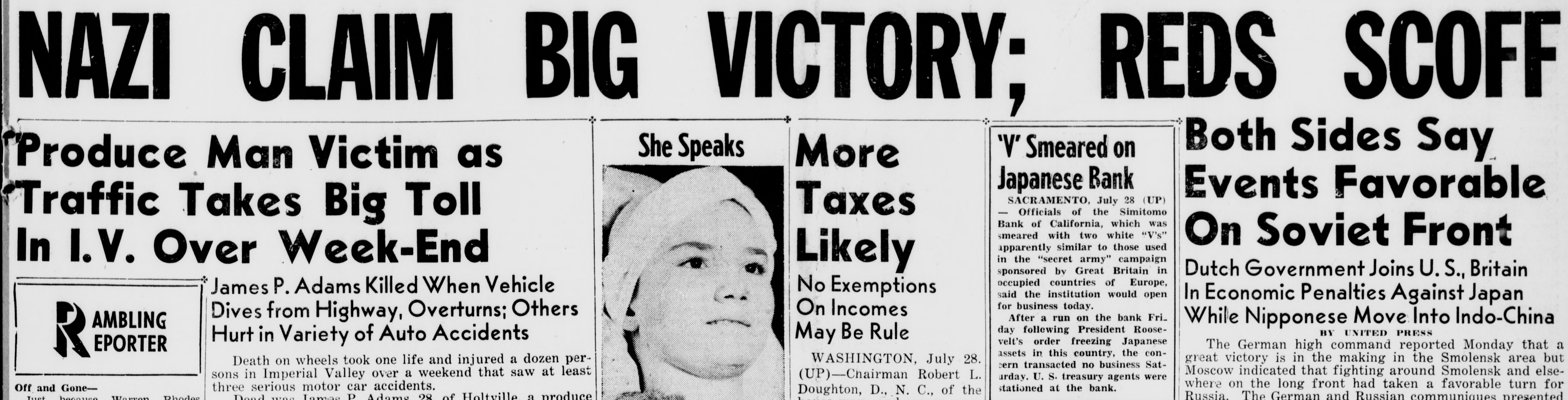 BIG NAZI REDS SCOFF CLAIM VICTORY; 'V' Smeared on She Speaks Both Sides Say More Produce Man Victim as Japanese Bank Events Favorable SACRAMENTO, July 28 (UP) Officials of the Simitomo Taxes Traffic Takes Big Toll Bank of California, which was smeared with two white "V's" On Soviet Front apparently similar to those used in the "secret army" campaign In I.V. Over Week-End Likely sponsored by Great Britain in Dutch Government Joins U.S., Britain occupied countries of Europe, James P. Adams Killed When Vehicle No Exemptions said the institution would open In Economic Penalties Against Japan for business today. On Incomes After a run on the bank Fri. Dives from Highway, Overturns; Others While Nipponese Move Into Indo-China AMBLING day following President RooseBY UNITED PRESS May Be Rule Hurt in Variety of Auto Accidents velt's order freezing Japanese The German high command reported Monday that a EPORTER assets in this country, the congreat victory is in the making in the Smolensk area but WASHINGTON, July 28. Death on wheels took one life and injured a dozen percern transacted no business SatMoscow indicated that fighting around Smolensk and else(UP)-Chairman Robert L. sons in Imperial Valley over a weekend that saw at least urday. U. S. treasury agents were where on the long front had taken a favorable turn for three serious motor car accidents. stationed at the bank. Off and GoneDoughton, D., N. C., of the Russia. The German and Russian communiques presented Worron Rhodes Dead was Jamas Adams 28 of Holtville a produce