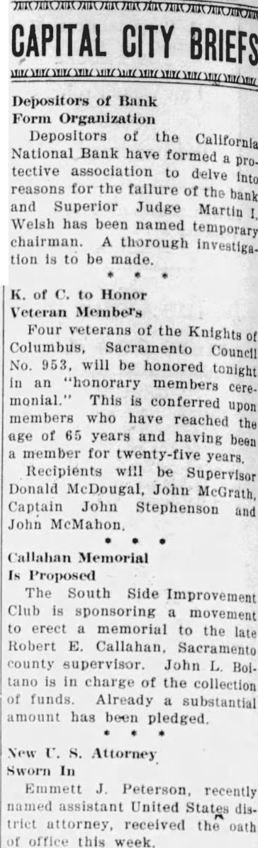 Callahan Memorial Is Proposed The South Side Improvement Club is sponsoring a movement to erect a memorial to the late Robert E. Callahan, Sacramento county supervisor. John L. Boitano is in charge of the collection of funds. Already a substantial amount has been pledged.