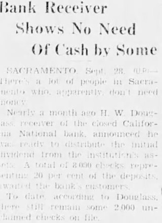 Less than 2000 persons have received their dividend checks from the California National bank, H. W. Douglass, receiver for the bank, revealed last night. He urged that depositors call at the bank as soon as possible in order that full use of an augmented personnel may be made. Douglass said the dividend response had been unusually slow. Depositors, he believes, have felt there was no immediate need for haste and preferred to wait a day or two until those more pressed for funds could be served. In few days those who have not called for their checks will be notified by mail. Savings deposits of the national bank existed in branch offices of the institution located outside of Sacramento, all local savings having been in the California Trust and Savings bank. First meeting of creditors of Fred W. Kiesel, former president of the California National and California Trust and Savings banks, who filed a petition in bankruptcy last week, will be held in the office of Evan J. Hughes, referee in bankruptcy, at 10 a. m. September 14.