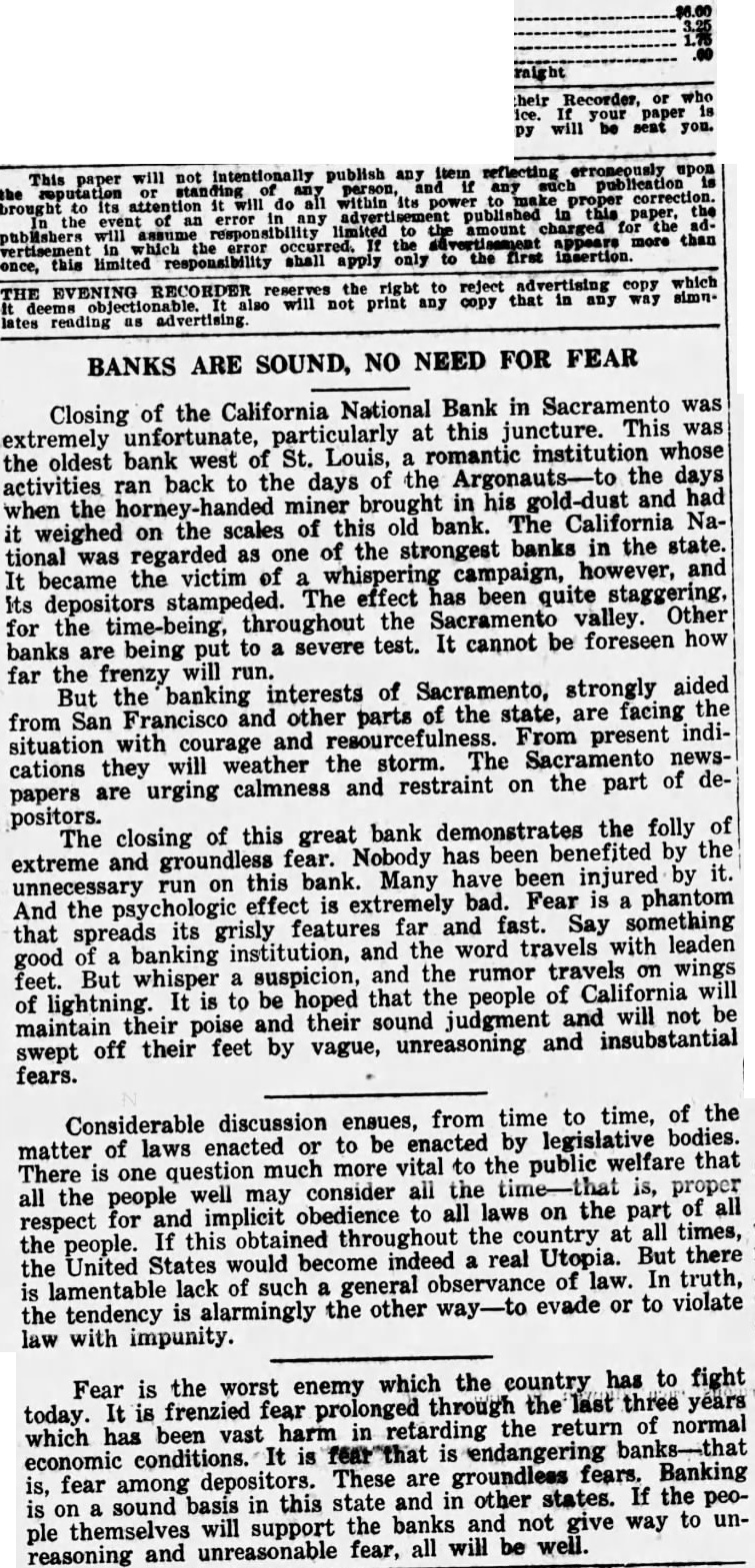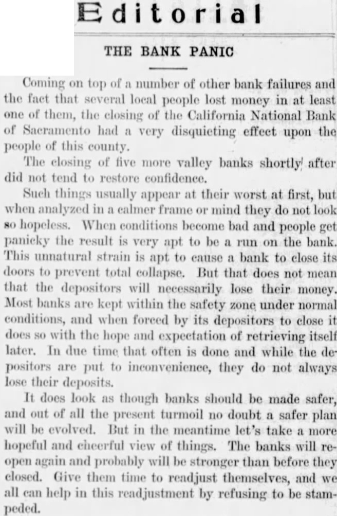 Coming on top of a number of other bank failures and the fact that several local people lost money in at least one of them, the closing of the California National Bank of Sacramento had a very disquieting effect upon the people of this county. The closing of five more valley banks shortly! after did not tend to restore confidence. Such things usually appear at their worst at first, but when analyzed in a calmer frame or mind they do not look hopeless. When conditions become bad and people get panicky the result is very apt to be a run on the bank. This unnatural strain is apt to cause a bank to close its doors to prevent total collapse. But that does not mean that the depositors will necessarily lose their money. Most banks are kept within the safety zone under normal conditions, and when forced by its depositors to close it does so with the hope and expectation of retrieving itself later. In due time that often is done and while the depositors are put to inconvenience, they do not always lose their deposits. It does look as though banks should be made safer, and out of all the present turmoil no doubt a safer plan will be evolved. But in the meantime take a more hopeful and cheerful view of things. The banks will reopen again and probably will be stronger than before they closed. Give them time to readjust themselves, and we all can help in this readjustment by refusing to be stampeded.
