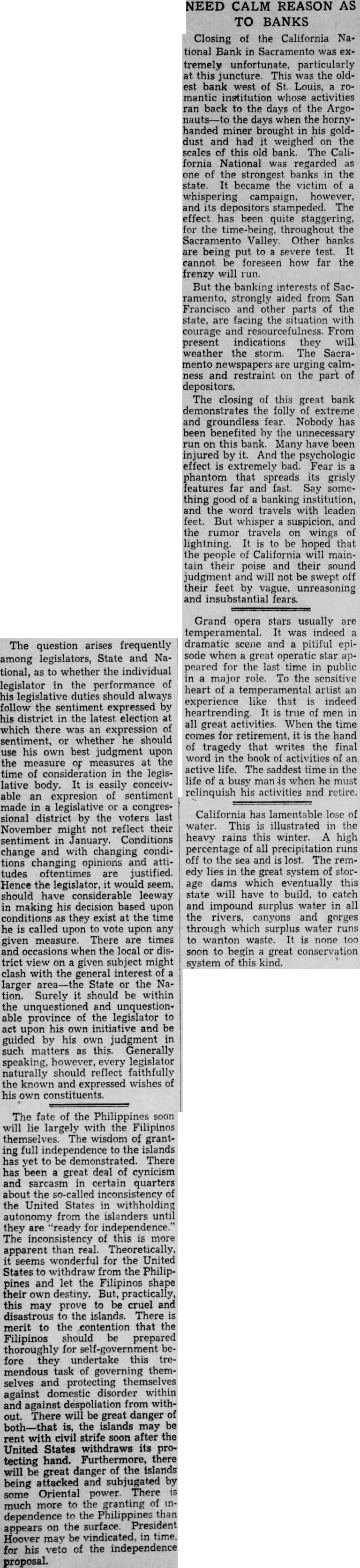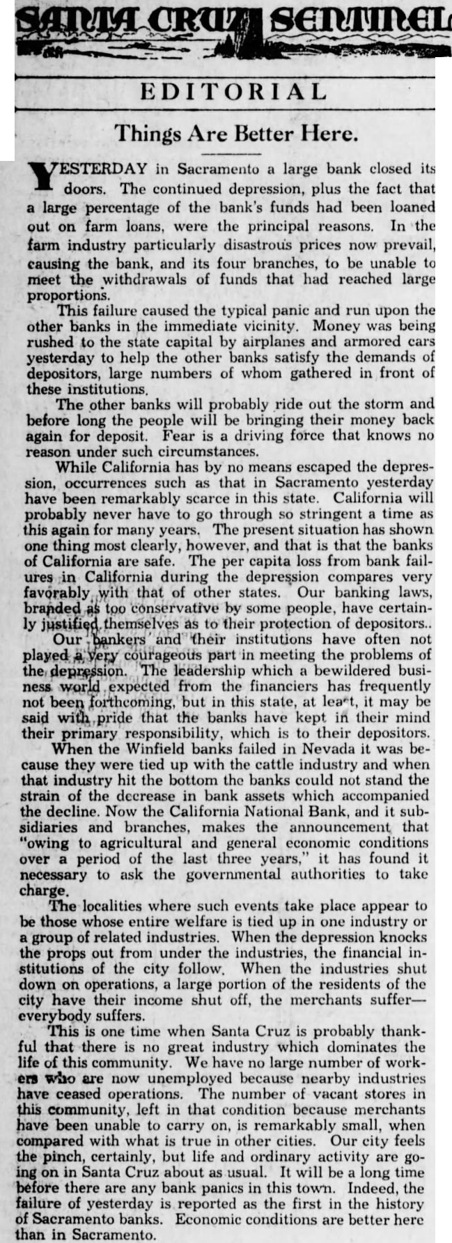 ESTERDAY in Sacramento a large bank closed its doors. The continued depression, plus the fact that a large percentage of the bank's funds had been loaned out on farm loans, were the principal reasons. In the farm industry particularly disastrous prices now prevail, causing the bank, and its four branches, to be unable to meet withdrawals of funds that had reached large proportions. This failure caused the typical panic and upon the other banks in the immediate vicinity. Money was being rushed to the state capital by airplanes and armored cars yesterday to help the other banks satisfy the demands of depositors, large numbers of whom gathered in front of these institutions. The other banks will probably ride out the storm and before long the people will be bringing their money back again for deposit. Fear is a driving force that knows no reason under such circumstances. While California has by no means escaped the depression, occurrences such as that in Sacramento yesterday have been remarkably scarce in this state. California will probably never have to go through so stringent a time as this again for many years. The present situation has shown one thing most clearly, however, and that is that the banks of California are safe. The per capita loss from bank failures in California during the depression compares very favorably with that of other states. Our banking laws, branded as too conservative by some people, have certainly justified themselves as to their protection of depositors.. Our bankers and their institutions have often not played very courageous part in meeting the problems of the depression. The leadership which a bewildered business world expected from the financiers has frequently not been forthcoming, but in this state, at leart, it may be said with pride that the banks have kept in their mind their primary responsibility, which is to their depositors. When the Winfield banks failed in Nevada it was because they were tied up with the cattle industry and when that industry hit the bottom the banks could not stand the strain of the decrease in bank assets which accompanied the decline. Now the California National Bank, and it subsidiaries and branches, makes the announcement that "owing to agricultural and general economic conditions over a period of the last three years," it has found it necessary to ask the governmental authorities to take charge. The localities where such events take place appear to be those whose entire welfare is tied up in one industry or a group of related industries. When the depression knocks the props out from under the industries, the financial institutions of the city follow. When the industries shut down on operations, a large portion of the residents of the city have their income shut off, the merchants suffereverybody suffers. This is one time when Santa Cruz is probably thankful that there is no great industry which dominates the life of this community. We have large number of workers who are now unemployed because nearby industries have ceased operations. The number of vacant stores in this community, left in that condition because merchants have been unable to carry on, is remarkably small, when compared with what is true in other cities. Our city feels the pinch, certainly, but life and ordinary activity are going on in Santa Cruz about as usual. It will be long time before there are any bank panics in this town. Indeed, the failure of yesterday is reported as the first in the history Sacramento banks. Economic conditions are better here than in Sacramento.
