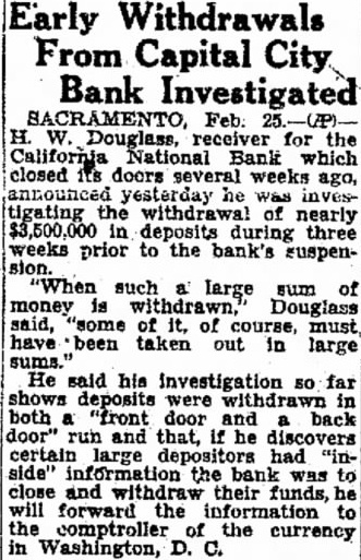 Early Withdrawals From Capital City Bank Investigated SACRAMENTO, Feb. Douglass, for the California National Bank which closed its doors weeks ago, yesterday he was investigating the withdrawal nearly $3,500,000 in deposits during three weeks prior to the bank's suspensuch a large sum of money Douglass said, "some of course, must, have been taken out large sums." He said his investigation so far shows deposits were withdrawn in both "front door and back door" run and that, he discovers certain large depositors had "inside" information the bank was close and their funds, forward the information the comptroller currency in Washington, D. C.