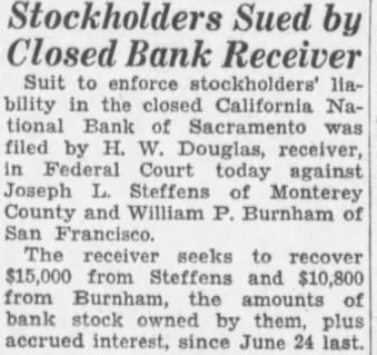 Stockholders Sued by Closed Bank Receiver Suit to enforce stockholders' liability in the closed California National Bank of Sacramento was filed by H. W. Douglas, receiver, in Federal Court today against Joseph L. Steffens of Monterey County and William P. Burnham of San Francisco. The receiver seeks to recover $15,000 from Steffens and $10,800 from Burnham, the of bank stock owned by them, plus accrued interest, since June 24 last.
