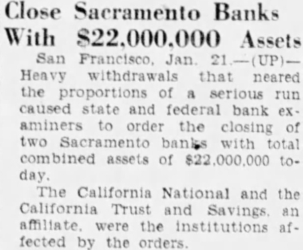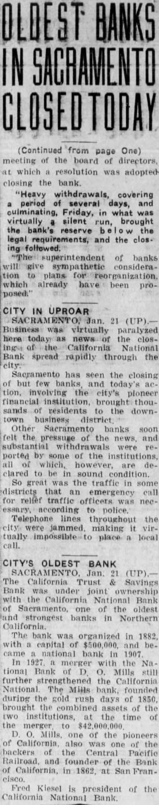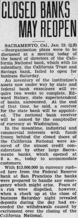 By McClatchy Newspaper Wire Jan. California National Bank, one of oldest financial institutions in the West, failed to open its doors business California and Savings Bank, state institution, likewise open. Heavy withdrawals during the several advanced reason the closing The board directors of the banks this morning and issued statement which expressed the hope that of reorganization with the of depositors, an The California National Bank about commercial counts, while the California Trust Savings Bank approximately 36,000 accounts Branch banks North mento, Arbuckle were affected by the closing order. California Trust and Savings Bank was closed by Rainey, state the ing in Francisco, Rainey said: Rainey's California Trust Savings Bank Sacramento over by the superintendent banks this morning, following meeting of the board of directors which resolution adopted closing the (This mesting held in San Francisco last night.) withdrawals covering period several days and culminating Friday silent run, brought bank's below the legal quirements, and the closing folsuperintendent of banks plans for reorganization which have proposed.' Statement The statement issued the bank's board of directors follows: "Owing agricultural and over of the last three years, Bank Sacramento and the Savings Bank have cent withdrawals cordingly, the directors, tection decided the state authorities to take charge of the institutions "It hoped that plan of organization can worked the of deposian date.' Hilliard president the House issued statement which that other banks in sufficient on hand to for all said: clearing house responsibility Sacramento are fully aware banks the occasioned closing the California National Bank the California Trust Savings are prepared that need not disturb conditions.