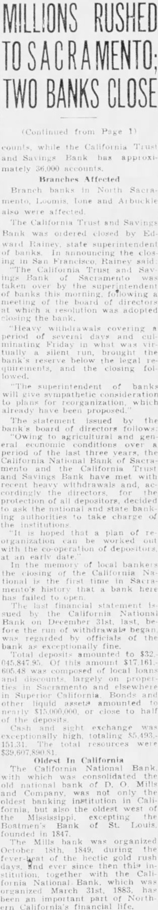 MILLIONS RUSHED TWO BANKS CLOSE from Page 1) the and Bank has mately Branches Affected Branch banks North and also The California and Savings Bank was closed by Ed state superintend of banks In the clos ing in said and Say of Sacramento by the of banks this flowing bill meeting of the board of at which resolution was adopted the covering a period of minating tually silent Tun, brought the reserve below the legal quirements, and the closing fol superintendent of banks will to for proposed The issued the bank's board of directors and gen eral conditions period of the last three the California Bank of Sacra California Trust and Bank have with and for the protection of all depositors, decided ask the and ing take charge the institutions hoped plan of be out with the co- of depositors at an In the the Na tional the time Sac mento's bank here has failed statement sued by the California National Bank last be fore the began was regarded by officials of the bank as amounted to $32 605.48 was composed of local on ties elsewhere in Super Bonds other liquid assets amounted or close to of the exchange was 493 high totaling 151 Oldest In California The California National Bank which consolidated old national bank of D. and not the only banking fornia but the oldest of Mississippi excepting the Boatmen's Bank of St. Louis founded Mills organized 18th the fever of the rush and together with the fornia National Bank which was March 31st 1883 has been important part of North an California's financial life.