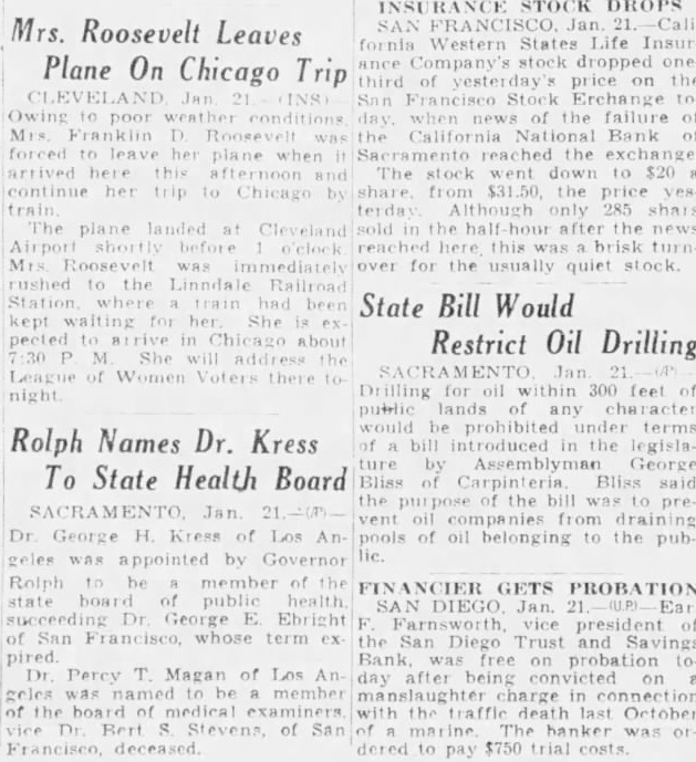 RANCE STOCK DROPS fornia Western States Life Insur Company's stock dropped one third of price on the San Francisco Erchange to failure of D. the Califor National Bank of nia forced her plane Sacramento the exchange afternoon and The stock down to $20 her trip to by share from the price Chicago terday Although only 285 shais The plane landed at Cleveland sold the half hour after the news before reached here this was turn Roosevelt immediately over for the usually quiet stock. rushed to the Linndale Railroad Station State Bill Would kept waiting She pected in Chicago about Restrict Oil Drilling M She the SACRAMENTO Jan League of Women Voters there to Drilling for oil within 300 feel of night public lands of be terms Rolph Names Dr. Kress of bill introduced the legislature Assemblyman George To State Health Board Bliss Carpinteria Bliss said the of the bill preSACRAMENTO Jan 21 Dr George H. Kress of Los An- pools of oil belonging to the pubgeles appointed by Governor Roinh to be member of the FINANCIER GETS PROBATION state board of public health SAN DIEGO Jan. Earl succeeding George E Ebright Farnsworth vice president of of San Francisco, whose term pired free on probation Dr. Percy T. Magan of Los An after being day on les was be member charge in of the board of medical the traffic death last October vice Bert of marine The banker was or deceased dered to pay $750 trial costs