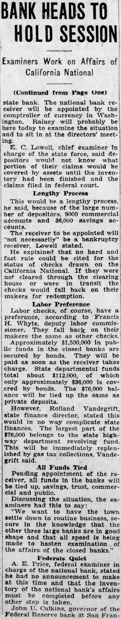 This would be lengthy process, he said, because of the large number of depositors, 9000 commercial accounts and 36,000 savings counts. The receiver to be appointed will "not necessarily" be bankruptcy receiver, Lowell stated. He explained that no hard and fast rule could be cited for the status of checks drawn on the California National. If they cleared through the clearing house were transit the checks would fall back on their makers for redemption. Labor Preference Labor checks, of course, have preference, according to Francis H. Whyte, deputy labor commissioner. They fall back on their makers the same other checks. Approximately $1,500,000 in public funds in the closed banks are secured by bonds. They will be paid as soon the receiver takes charge. State departmental funds total about of which only approximately $36,000 is ered bonds. The $76,000 balance will be tied the same private deposits. However, Rolland Vandegrift, state finance director, stated this would in way complicate state finances. The largest part the $76,000 belongs to the state highway revolving fund. This will be immediately replenished by gas tax collections, Vandegrift said.