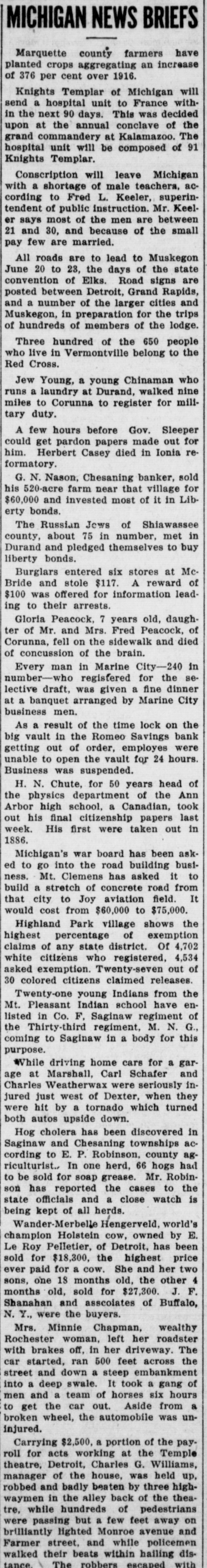 # MICHIGAN NEWS BRIEFS Marquette county farmers have planted crops aggregating an increase of 376 per cent over 1916. Knights Templar of Michigan will send a hospital unit to France within the next 90 days. This was decided upon at the annual conclave of the grand commandery at Kalamazoo. The hospital unit will be composed of 91 Knights Templar. Conscription will leave Michigan with a shortage of male teachers, according to Fred L. Keeler, superintendent of public instruction. Mr. Keeler says most of the men are between 21 and 30, and because of the small pay few are married. All roads are to lead to Muskegon June 20 to 23, the days of the state convention of Elks. Road signs are posted between Detroit, Grand Rapids, and a number of the larger cities and Muskegon, in preparation for the trips of hundreds of members of the lodge. Three hundred of the 650 people who live in Vermontville belong to the Red Cross. Jew Young, a young Chinaman who runs a laundry at Durand, walked nine miles to Corunna to register for military duty. A few hours before Gov. Sleeper could get pardon papers made out for him. Herbert Casey died in Ionia reformatory. G. N. Nason, Chesaning banker, sold his 520-acre farm near that village for $60,000 and invested most of it in Liberty bonds. The Russian Jews of Shiawassee county, about 75 in number, met in Durand and pledged themselves to buy liberty bonds. Burglars entered six stores at McBride and stole $117. A reward of $100 was offered for information leading to their arrests. Gloria Peacock, 7 years old, daughter of Mr. and Mrs. Fred Peacock, of Corunna, fell on the sidewalk and died of concussion of the brain. Every man in Marine City-240 in number-who registered for the selective draft, was given a fine dinner at a banquet arranged by Marine City business men. As a result of the time lock on the big vault in the Romeo Savings bank getting out of order, employes were unable to open the vault for 24 hours. Business was suspended. H. N. Chute, for 50 years head of the physics department of the Ann Arbor high school, a Canadian, took out his final citizenship papers last week. His first were taken out in 1886. Michigan's war board has been asked to go into the road building business. Mt. Clemens has asked it to build a stretch of concrete road from that city to Joy aviation field. It would cost from $60,000 to $75,000. Highland Park village shows the highest percentage of exemption claims of any state district. Of 4,702 white citizens who registered, 4,534 asked exemption. Twenty-seven out of 30 colored citizens claimed releases. Twenty-one young Indians from the Mt. Pleasant Indian school have enlisted in Co. F, Saginaw regiment of the Thirty-third regiment, M. N. G., coming to Saginaw in a body for this purpose. While driving home cars for a garage at Marshall, Carl Schafer and Charles Weatherwax were seriously injured just west of Dexter, when they were hit by a tornado which turned both autos upside down. Hog cholera has been discovered in Saginaw and Chesaning townships according to E. P. Robinson, county agriculturist. In one herd, 66 hogs had to be sold for soap grease. Mr. Robinson has reported the cases to the state officials and a close watch is being kept of all herds. Wander-Merbelle Hengerveld, world's champion Holstein cow, owned by E. Le Roy Pelletier, of Detroit, has been sold for $18,300, the highest price ever paid for a cow. She and her two sons, one 18 months old, the other 4 months old, sold for $27,300. J. F. Shanahan and asscoiates of Buffalo, N. Y., were the buyers. Mrs. Minnie Chapman, wealthy Rochester woman, left her roadster with brakes off, in her driveway. The car started, ran 500 feet across the street and down a steep embankment into a deep swale. It took a gang of men and a team of horses six hours to get the car out. Aside from a broken wheel, the automobile was uninjured. Carrying $2,500, a portion of the payroll for acts working at the Temple theatre, Detroit, Charles G. Williams, manager of the house, was held up, robbed and badly beaten by three highwaymen in the alley back of the theatre, while hundreds of pedestrians were passing but a few feet away on brilliantly lighted Monroe avenue and Farmer street, and while policemen walked their beats within hailing distance. The robbers escaped with