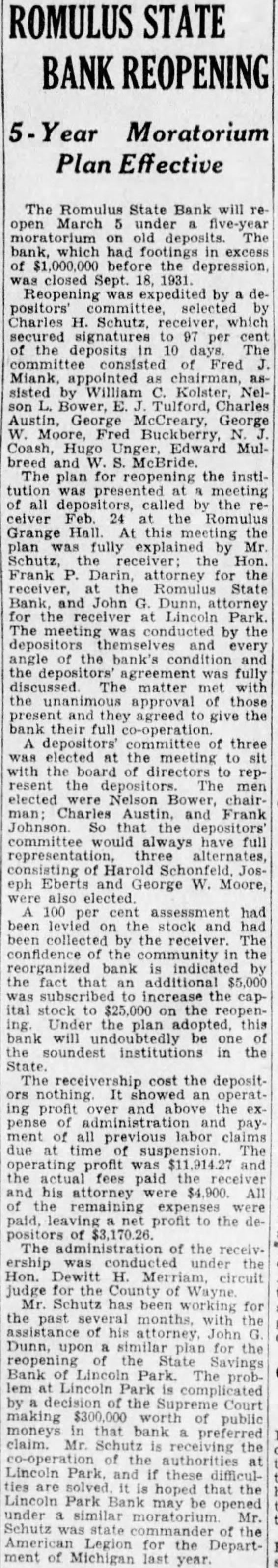 ROMULUS STATE BANK REOPENING Moratorium Plan Effective The Romulus State Bank will open March old which had footings excess before closed Sept. 1931 Reopening expedited by positors Charles H. the deposits The committee Fred appointed chairman, sisted by William Kolster, NelTulford, Charles Austin, George McCreary, George Coash, Hugo Edward Mulbreed McBride plan for reopening the institution presented all called by the ceiver Feb. Romulus Grange At this the fully explained by Mr Schutz, Hon. Frank attorney the receiver, Bank, Dunn, the Lincoln Park. by the every angle the bank's condition and agreement was fully discussed The matter approval those agreed give their committee three was elected the meeting sit board directors represent the The elected were Nelson Bower, Charles and Frank Johnson depositors' committee would always have full consisting Eberts George W. Moore, also 100 assessment had been levied stock and collected the The confidence community the the fact ital stock $25,000 the Under plan this bank one soundest institutions the cost the depositnothing an profit and pense of ment of all labor time suspension profit was the actual fees paid his attorney All remaining paid, profit the The the receivership Hon. Dewitt H. circuit judge for the County Wayne Mr. Schutz has been for the past several John Dunn, Savings Bank lem Lincoln decision the Court making $300,000 worth moneys that bank preferred claim. Mr. Schutz receiving co-operation authorities Lincoln Park, and these solved that the Lincoln may under similar Mr. Schutz American Legion the Department Michigan year.