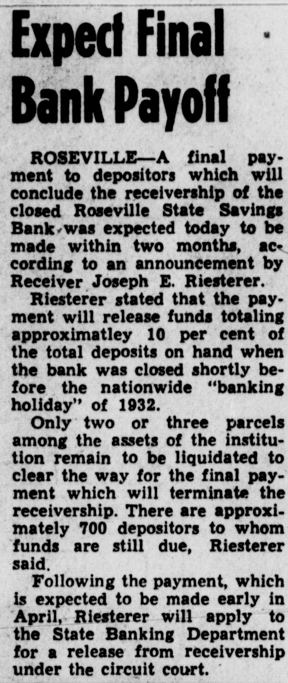 Expect Final Bank Payoff ROSEVILLE-A final payment to depositors which will conclude the receivership of the closed Roseville State Savings Bank was expected today to be made within two months, according to an announcement by Receiver Joseph E. Riesterer. Riesterer stated that the payment will release funds totaling approximatley 10 per cent of the total deposits on hand when the bank was closed shortly before the nationwide "banking holiday" of 1932. Only two or three parcels among the assets of the institution remain to be liquidated to clear the way for the final payment which will terminate the receivership. There are approximately 700 depositors to whom funds are still due, Riesterer said. Following the payment, which is expected to be made early in April, Riesterer will apply to the State Banking Department for a release from receivership under the circuit court.