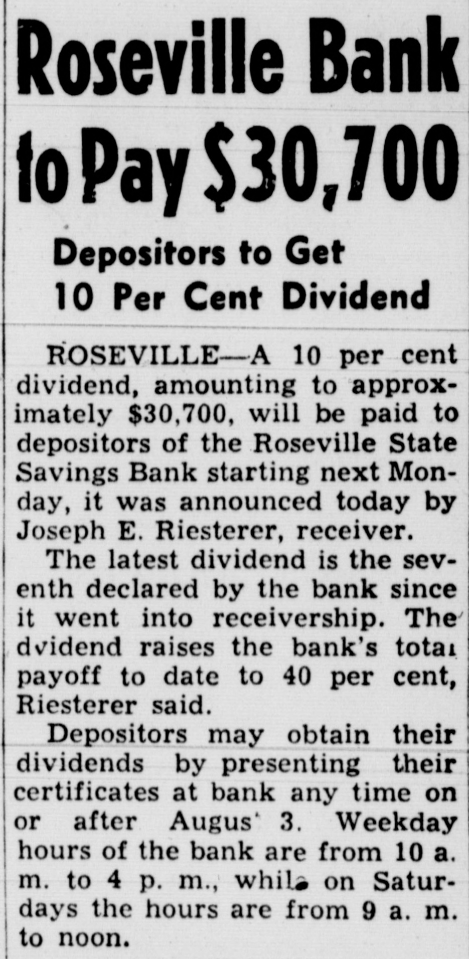 Roseville Bank to Pay $30,700 Depositors to Get 10 Per Cent Dividend ROSEVILLE-A 10 per cent dividend, amounting to approximately $30,700, will be paid to depositors of the Roseville State Savings Bank starting next Monday, it was announced today by Joseph E. Riesterer, receiver. The latest dividend is the seventh declared by the bank since it went into receivership. The dvidend raises the bank's total payoff to date to 40 per cent, Riesterer said. Depositors may obtain their dividends by presenting their certificates at bank any time on or after Augus 3. Weekday hours of the bank are from 10 a. m. to 4 p. m., while on Saturdays the hours are from 9 a. m. to noon.