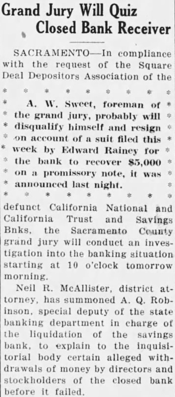 A. W. Sweet, foreman of the grand jury, probably will disqualify himself and resign on account of suit filed this week by Edward Rainey for the bank to recover $5,000 on a promissory note, it was announced last night. defunct California National and California Trust and Savings Bnks, the Sacramento County grand jury will conduct an investigation into the banking situation starting at 10 o'clock tomorrow morning. Neil R. McAllister, district attorney, has summoned A. Q. Robinson. special deputy of the state banking department in charge of the liquidation of the savings bank, to explain to the inquisitorial body certain alleged withdrawals of money by directors and stockholders of the closed bank before it failed.