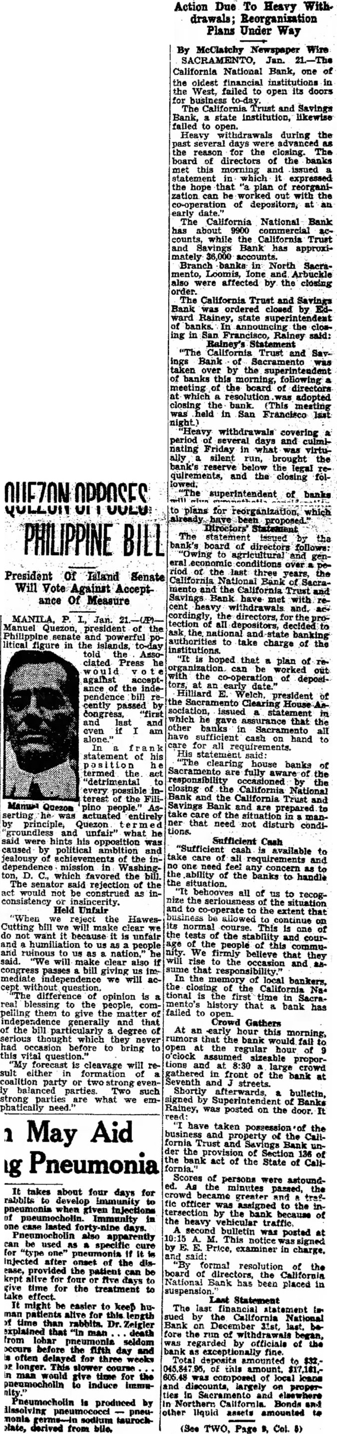 Sufficient Cash "Sufficient cash available take and one feel concern the ability the banks to handle situation. behooves all of to recogthe seriousness co-operate the extent that business be allowed continue its normal course. is one the tests of the stability and courpeople this commuWe believe they will occasion and In the of local bankers, the of the California tional first time mento's history that bank failed to open. Crowd Gathers At an bank fail open the regular hour o'clock proportions at large crowd gathered front bank at Seventh streets. Shortly bulletin, signed Rainey, posted on the door. have taken the the fornia Trust and Bank unthe Section act of the State of CaliScores persons were astoundthe greater fic officer the by the bank because the heavy traffic. second bulletin was posted notice Price, examiner in charge, formal resolution the board directors, the California National Bank placed in effect. Last Statement might easier to keep hu- The the time than Dr Zeigler Bank 31st, that death fore the of from lobar seldom officials of occurs before the fifth day often delayed for three weeks Total deposits amounted longer. slower course time loans Pneumocholin produced by California Bonds and dissolving pneu- liquid assets monia olate, derived from bile. (See Page Col.