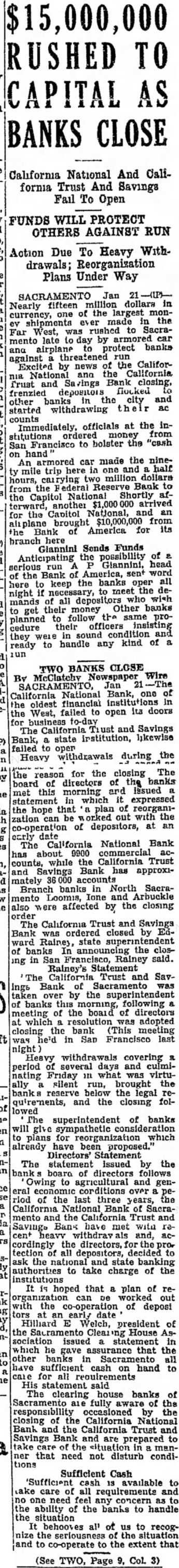 Nearly fifteen dollars of the largest monmade the rushed to SacraFar West, was late day by armored mento banks airplane against the CaliforExcited news California Trust and Bank closing, frenzied the and other started withdrawing counts Immediately, officials at the from inbolster the "cash to on hand armored car made the ninetrip one million dollars Reserve Bank the Federal National Shortly the Capitol another arrived terward, the Capitol National, for $10,000,000 Bank brought of America for Glannini Sends Funds possibility of serious the Bank keep the banks here the mands Other banks their money follow the planned their officers insisting cedure they sound ready to handle any kind of