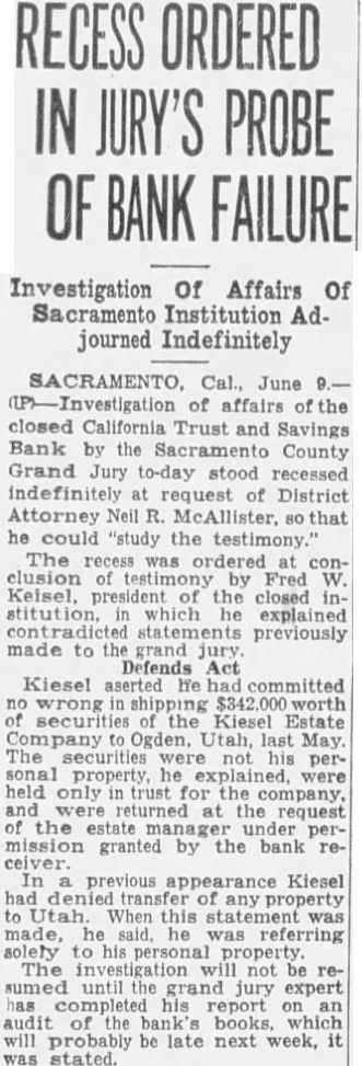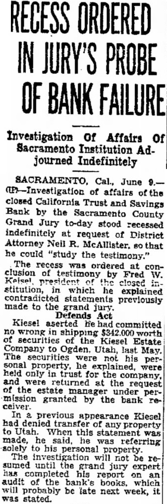SACRAMENTO, Cal., June (P-Investigation of affairs of the closed California Trust and Savings Bank by the Sacramento County Grand Jury to-day stood recessed indefinitely at request of District Attorney Neil R. McAllister. 80 that he could "study the testimony.' The recess was ordered at conclusion of testimony by Fred W. Keisel, president of the closed institution, in which he explained contradicted statements previously made to the grand jury. Defends Act Kiesel aserted he had committed no wrong in $342,000 worth of securities of the Kiesel Estate Company to Ogden, Utah, last May. The securities were not his personal property, he explained, were held only in trust for the company, and were returned at the request of the estate under permission granted by the bank receiver. In previous appearance Kiesel had denied transfer of any property to Utah. When this statement was made, he said, he was referring solely to his personal property. The investigation will not be resumed until the grand jury expert has completed his report on an audit of the bank's books, which will probably be late next week, it was stated.