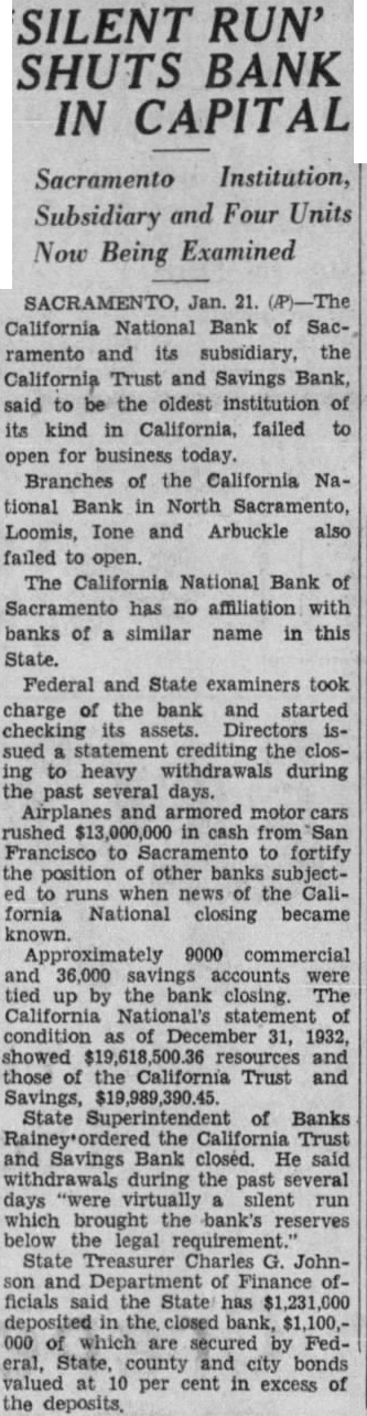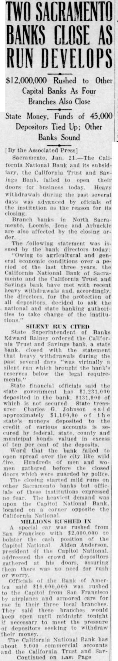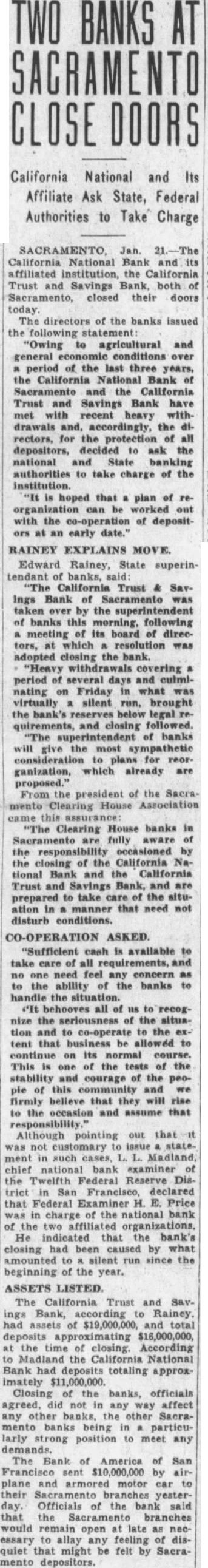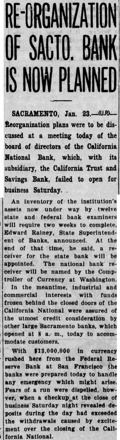 By McClatchy Newspaper Wire Jan. California National Bank, one of oldest financial institutions in the West, failed to open its doors business California and Savings Bank, state institution, likewise open. Heavy withdrawals during the several advanced reason the closing The board directors of the banks this morning and issued statement which expressed the hope that of reorganization with the of depositors, an The California National Bank about commercial counts, while the California Trust Savings Bank approximately 36,000 accounts Branch banks North mento, Arbuckle were affected by the closing order. California Trust and Savings Bank was closed by Rainey, state the ing in Francisco, Rainey said: Rainey's California Trust Savings Bank Sacramento over by the superintendent banks this morning, following meeting of the board of directors which resolution adopted closing the (This mesting held in San Francisco last night.) withdrawals covering period several days and culminating Friday silent run, brought bank's below the legal quirements, and the closing folsuperintendent of banks plans for reorganization which have proposed.' Statement The statement issued the bank's board of directors follows: "Owing agricultural and over of the last three years, Bank Sacramento and the Savings Bank have cent withdrawals cordingly, the directors, tection decided the state authorities to take charge of the institutions "It hoped that plan of organization can worked the of deposian date.' Hilliard president the House issued statement which that other banks in sufficient on hand to for all said: clearing house responsibility Sacramento are fully aware banks the occasioned closing the California National Bank the California Trust Savings are prepared that need not disturb conditions.