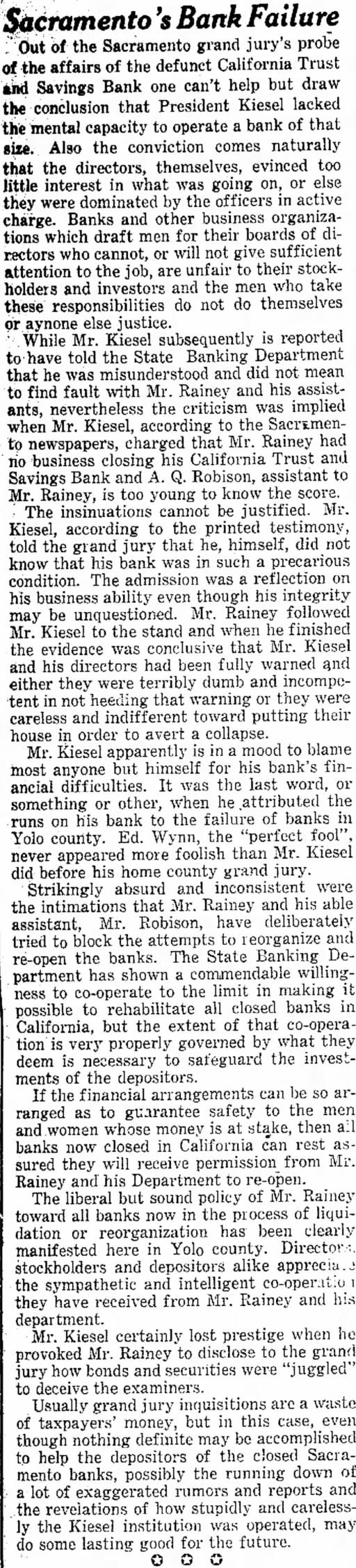 Sacramento grand jury's probe Out of the the affairs of the defunct California Trust can't help but draw and Savings Bank one the conclusion that President Kiesel lacked the mental capacity to operate bank of that size. Also the conviction comes naturally that the directors, themselves, evinced too interest in what was going on, or else they were dominated by the officers in active charge. Banks and other business organizafor their boards of ditions which draft men rectors who cannot, or will not give sufficient unfair to their stockattention to the are holders and investors and the men who take do not do themselves these responsibilities else justice. aynone While Mr. Kiesel subsequently is reported to have told the State Banking Department that he was misunderstood and did not mean to find fault with Mr. Rainey and his assistants, nevertheless the criticism was implied when Mr. Kiesel, according to the Sacramenthat Mr. Rainey had to newspapers, charged business closing his California Trust and Savings Bank and Robison, assistant to Rainey, is too young to know the score. The insinuations cannot be justified. Mr. Kiesel, according to the printed testimony, that he, himself, did not told the grand jury know that his bank was in such a precarious The admission was reflection on condition. business ability even though his integrity may be unquestioned. Mr. Rainey followed Mr. Kiesel to the stand and when he finished the evidence was conclusive that Mr. Kiesel and his directors had been fully warned and either they were terribly dumb and incompetent in not heeding that warning or they were careless and indifferent toward putting their house order to avert collapse. Mr. Kiesel apparently is in a mood to blame most anyone but himself for his findifficulties. It was the last word, or ancial something or other, when he attributed the runs on his bank to the failure of banks in Yolo Ed. Wynn, the "perfect county. never appeared more foolish than Mr. Kiesel did before his home county grand jury. Strikingly absurd and inconsistent were the intimations that Mr. Rainey and his able Mr. Robison, have deliberately assistant, tried to block the attempts to reorganize and banks. The State Banking Dethe re-open partment has shown commendable willingness to co-operate to the limit in making it possible to rehabilitate all closed banks in California, but the extent of that co-operation is very properly governed by what they deem is necessary to safeguard the investments of the depositors. the financial arrangements can be SO arranged as to guarantee safety to the men and women whose money is at stake, then all banks now closed in California can rest assured they will receive permission from Mr. Rainey and his Department to re-open. The liberal but sound policy of Mr. Rainey toward all banks now in the process of liquidation or reorganization has been clearly manifested here in Yolo county. stockholders and depositors alike apprecia. the sympathetic and intelligent co-operation they have received from Mr. Rainey and his Mr. Kiesel certainly lost prestige when he provoked Mr. Rainey to disclose to the grand how bonds and securities were "juggled" to deceive the examiners. Usually grand jury inquisitions are waste of taxpayers' money, but in this case, even though nothing definite may be accomplished to help the depositors of the closed Sacramento banks, possibly the running down of lot of exaggerated rumors and reports and the revelations of how stupidly and carelessthe Kiesel institution was operated, may do some lasting good for the future.