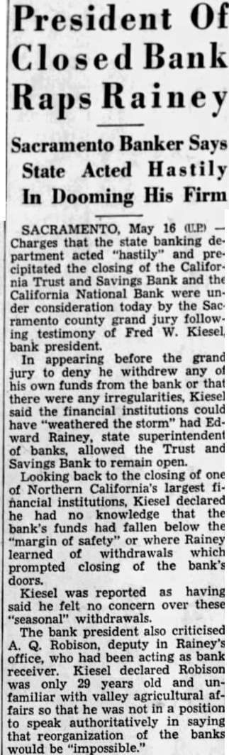 SACRAMENTO, May 16 (U.P.) Charges that the state banking department acted "hastily" and precipitated the closing of the California Trust and Savings Bank and the California National Bank were under consideration today by the Sacramento county grand jury following testimony of Fred W. Kiesel, bank president. In appearing before the grand jury to deny he withdrew any of his own funds from the bank or that there were any irregularities, Kiesel said the financial institutions could have "weathered the storm" had Edward Rainey, state superintendent of banks, allowed the Trust and Savings Bank to remain open. Looking back to the closing of one of Northern California's largest financial institutions, Kiesel declared he had no knowledge that the bank's funds had fallen below the "margin of safety" or where Rainey learned of withdrawals which prompted closing of the bank's doors. Kiesel was reported as having said he felt no concern over these "seasonal" withdrawals. The bank president also criticised A. Q. Robison, deputy in Rainey's office, who had been acting as bank receiver. Kiesel declared Robison was only 29 years old and unfamiliar with valley agricultural affairs so that he was not in a position to speak authoritatively in saying that reorganization of the banks would be "impossible."