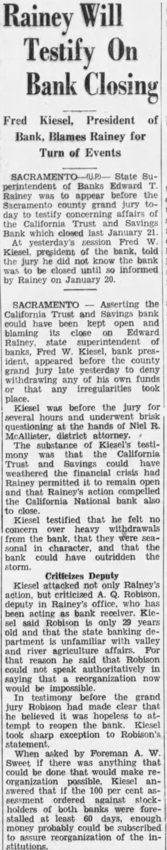 SACRAMENTO Asserting the California Trust and Savings bank could have been kept open and blaming its close on Edward Rainey, state superintendent of banks, Fred W. Kiesel, bank president, appeared before the county grand jury late yesterday to deny withdrawing any of his own funds or that any irregularities took place. Kiesel was before the jury for several hours and brisk questioning at the hands of Niel R. McAllister, district attorney. The substance of Kiesel's testimony was that the California Trust Savings could have weathered the financial crisis had Rainey permitted it to remain open and that Rainey's action compelled the California National bank also to close. Kiesel testified that he felt no concern over heavy withdrawals from the bank. that they were seasonal in character, and that the bank could have outridden the storm.