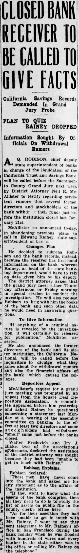 Q. ROBISON, chief deputy A. state superintendent of banks charge the liquidation of the California Trust and Savings Bank will be called before the SacramenCounty Grand Jury next week by District Attorney Neil R. McAllister to testify regarding persistent rumors several former directors stockholders of the bank withd: their funds just fore the institution closed last Jan uary 21st. McAllister announced plans call in Edward state supof