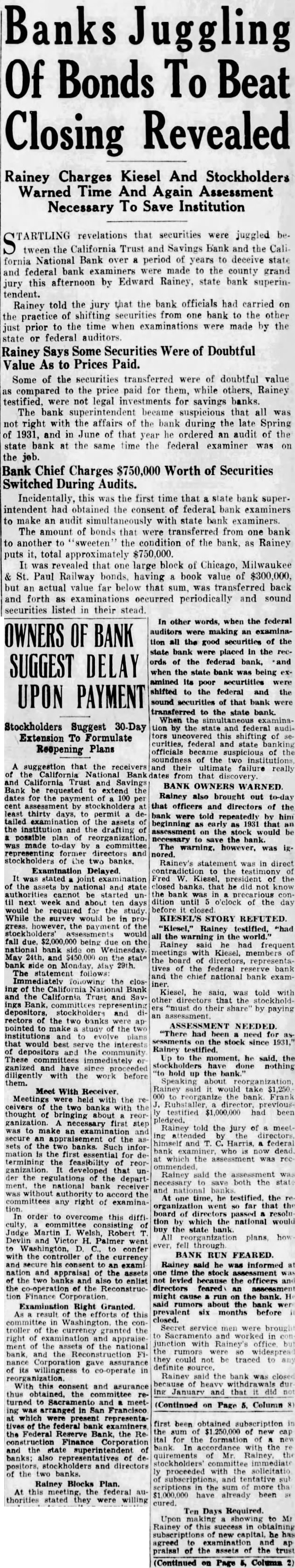 TARTLING revelations that securities were juggled between the California Trust and Savings Bank and the California National Bank over 8 period of years to deceive state federal bank examiners were made to the county grand and jury this afternoon by Edward Rainey, state bank superintendent. Rainey told the jury that the bank officials had carried on the practice of shifting securities from one bank to the other just prior to the time when examinations were made by the state or federal auditors. Rainey Says Some Securities Were of Doubtful Value As to Prices Paid.
